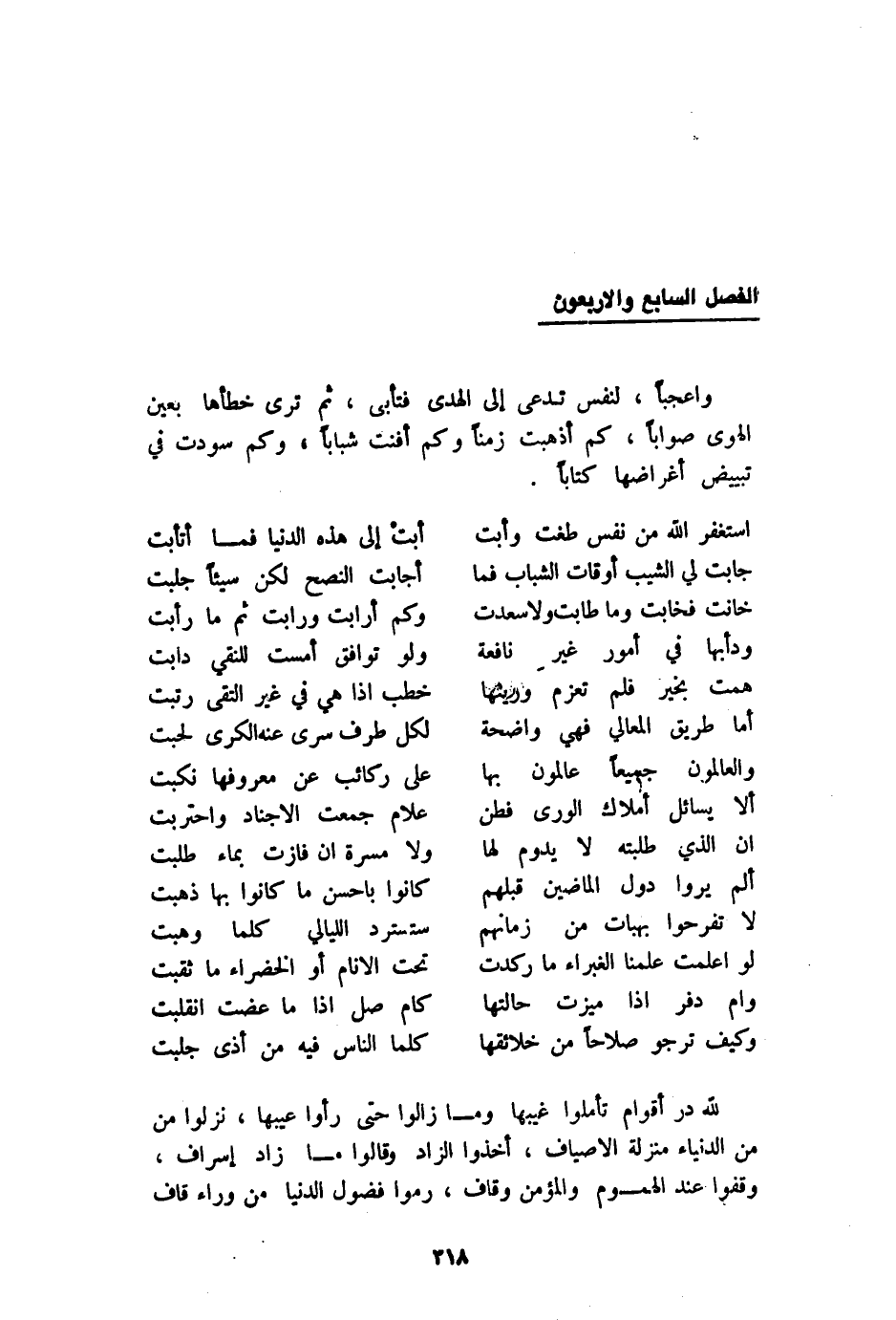 وَاعجَبا لنَفس تدعى إِلَى الْهدى فتأبى ثمَّ ترى خطأها بِعَين الْهوى صَوَابا كم أذهبت زَمنا وَكم أفنت شبَابًا وَكم سودت فِي تبييض أغراضها كتابا