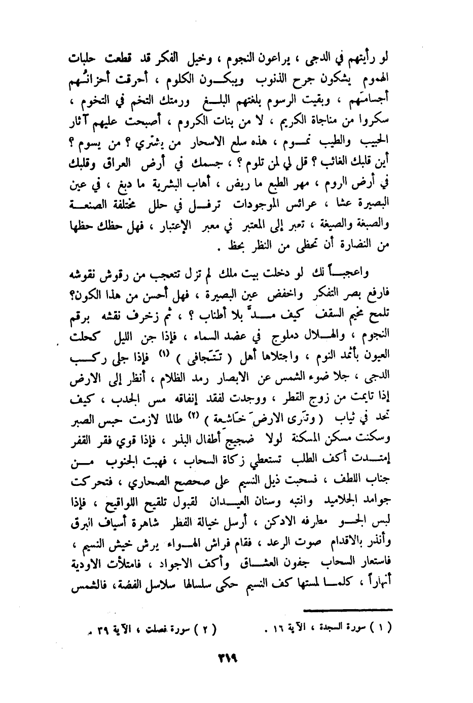لَو رَأَيْتهمْ فِي الدجى يراعون النُّجُوم وخيل الفكرة قد قطعت حلبات الهموم يَشكونَ جرح الذُّنُوب ويبكون الكلوم أحرقت أحزانهم أجسامهم وَبقيت الرسوم بلغتهم البلغ ورمتك التخم فِي التخوم سَكِرُوا من مُنَاجَاة الْكَرِيم لَا من بَنَات الكروم أَصبَحت عَلَيْهِم آثَار الحبيب وَالطّيب نموم هَذِه سلع الأسحار من يَشْتَرِي من يسوم أَيْن قَلْبك الْغَائِب قل لي لمن تلوم جسمك فِي أَرض الْعرَاق وقلبك فِي أَرض الرّوم مهر الطَّبْع مَا ريض أهاب البشرية مَا دبغ فِي عين البصيرة عشا عرائس الموجودات ترفل فِي حلل مُخْتَلفَة الصَّنْعَة والصبغة والصيغة تعبر إِلَى الْمُعْتَبر فِي معبر الِاعْتِبَار فَهَل حظك حظها من النضارة أَن تحظى من النّظر بحظ