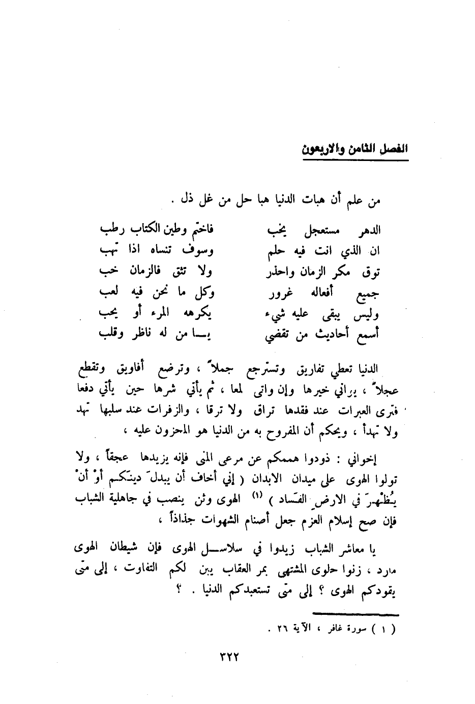 يَا معشر الشَّبَاب زيدوا فِي سلاسل الْهوى فَإِن شَيْطَان الْهوى مارد زنوا حلوى المشتهى بمر الْعقَاب يبن لكم التَّفَاوُت إِلَى مَتى يقودكم الْهوى إِلَى مَتى تستعبدكم الدُّنْيَا