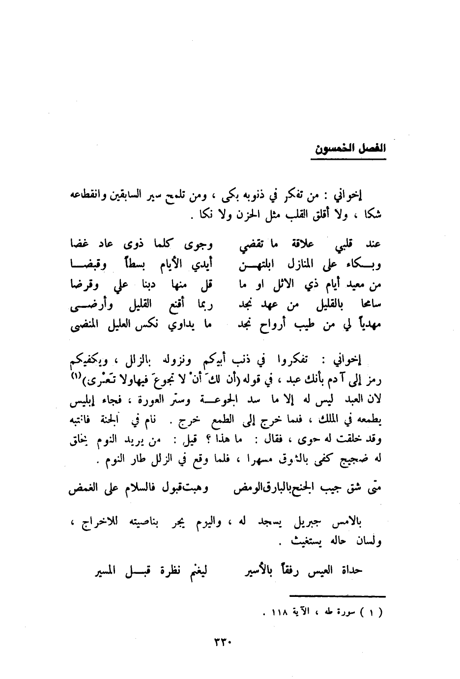 إخْوَانِي تَفَكَّرُوا فِي ذَنْب أبيكم ونزوله بالزلل ويكفيكم رمز إِلَى آدم بأنك عبد فِي قَوْله {إِن لَك أَلا تجوع فِيهَا وَلَا تعرى} لِأَن العَبْد لَيْسَ لَهُ إِلَّا مَا سد الجوعة وَستر الْعَوْرَة فجَاء إِبْلِيس يطمهه فِي الْملك فَلَمَّا خرج إِلَى الطمع خرج نَام فِي الْجنَّة فانتبه وَقد خلقت لَهُ حوى فَقَالَ مَا هَذَا قيل من يُرِيد النّوم بِخلق لَهُ ضجيج كفى بالشوق مسهرا فَلَمَّا وَقع فِي الزلل طَار النّوم
