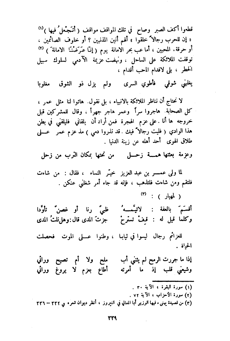 قطعُوا أكف الصَّبْر وَصَاح فِي تِلْكَ المواقف مَوَاقِف {أَتجْعَلُ فِيهَا} إِن للحرب رجَالًا خلقُوا ألهم أَنِين المذنبين أَو خلوف الصائمين أَو حرقة المحبين أما عب بَحر الْأَمَانَة يَوْم {إِنَّا عرضنَا الْأَمَانَة} توقفت الْمَلَائِكَة على السَّاحِل ونهضت عَزِيمَة الْآدَمِيّ لسلوك سَبِيل الْخطر بلَى لاقدام الْمُحب أَقْدَام