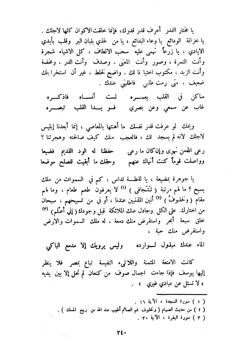 يَا مُخْتَار الْقدر أعرف قدر قدرك فَإِنَّمَا خلقت الأكوان كلهَا لِأَجلِك يَا خزانَة الودائع يَا وعَاء الْبَدَائِع يَا من غذي بلبان الْبر وقلب بأيدي الأيادي يَا زرعا تهمى عَلَيْهِ سحب الألطاف كل الْأَشْيَاء شَجَرَة وَأَنت الثَّمَرَة وصور وَأَنت الْمَعْنى وصدف وَأَنت الدّرّ ومخضة وَأَنت الزّبد مَكْتُوب اختيارنا لَك وَاضح لخلط غير أَن استخراجك ضَعِيف مَتى رمت طلبي فاطلبني عنْدك