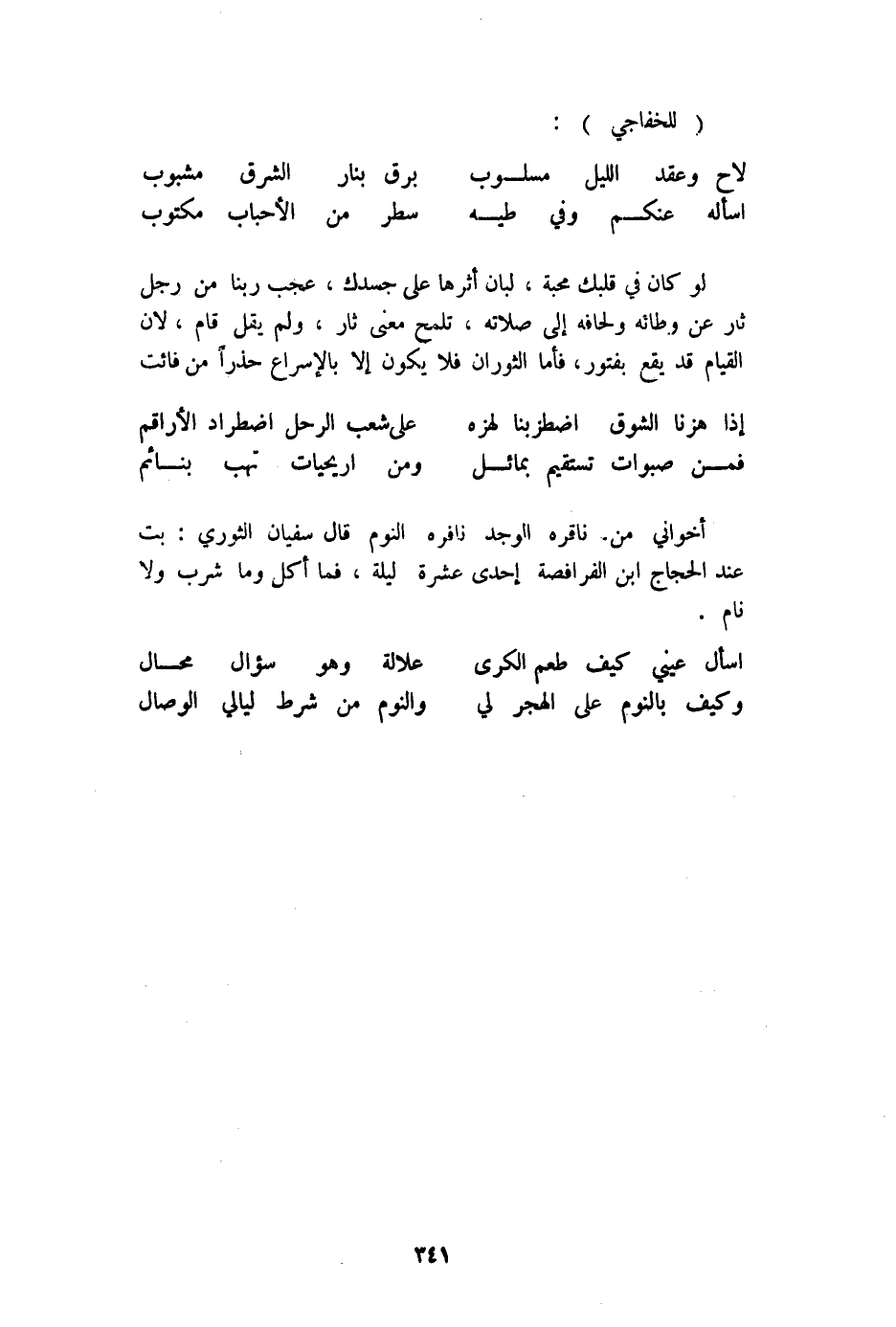 أخواني من ناقره الوجد نافره النّوم قَالَ سُفْيَان الثَّوْريّ بت عِنْد الْحجَّاج ابْن الفرافصة إِحْدَى عشرَة لَيْلَة فَمَا أكل وَمَا شرب وَلَا نَام