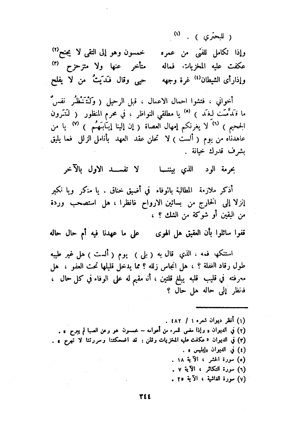 أخواني فتشوا أحمال الْأَعْمَال قبل الرحيل {ولتنظر نفس مَا قدمت لغد} يَا مطلقي النواظر فِي محرم المنظور {لترون الْجَحِيم} لَا يَغُرنكُمْ إمهال العصاة {إِن إِلَيْنَا إيابهم} يَا من عهدناه من يَوْم {أَلَسْت} لَا تحلن عقد الْعَهْد بأنامل الزلل فَمَا يَلِيق بشرف قدرك خِيَانَة