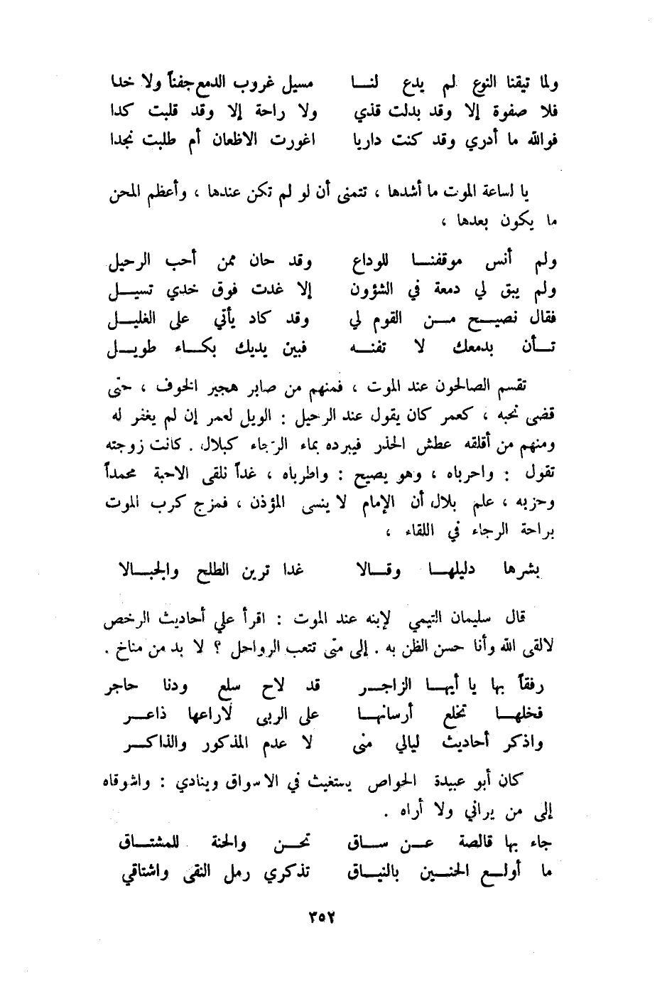 تقسم الصالحون عِنْد الْمَوْت فَمنهمْ من صابر هجير الْخَوْف حَتَّى قضى نحبه كعمر كَانَ يَقُول عِنْد الرحيل الويل لعمر إِن لم يغْفر لَهُ وَمِنْهُم من أقلقه عَطش الحذر فيبرده بِمَاء الرَّجَاء كبلال كَانَت زَوجته تَقول واحرباه وَهُوَ يَصِيح واطرباه غَدا نلقى الْأَحِبَّة مُحَمَّدًا وحزبة علم بِلَال أَن الإِمَام لَا ينسى الْمُؤَذّن فمزج كرب الْمَوْت براحة الرَّجَاء فِي اللِّقَاء