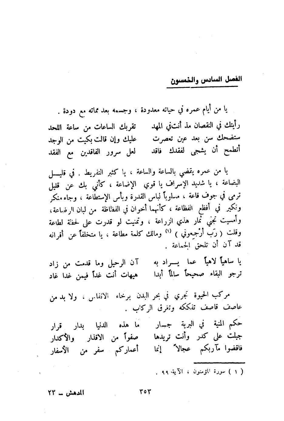 يَا من عمره يقْضِي بالساعة والساعة يَا كثير التَّفْرِيط فِي قَلِيل البضاعة يَا شَدِيد الْإِسْرَاف يَا قوي الإضاعة كَأَنِّي بك عَن قَلِيل ترمى فِي جَوف قاعة مسلوبا لِبَاس الْقُدْرَة وبأس الِاسْتِطَاعَة وَجَاء مُنكر وَنَكِير فِي أفظع الفظاعة كَأَنَّهُمَا أَخَوان فِي الفظاظة من لبان الرضَاعَة وأمسيت تجني ثمار هذي الزِّرَاعَة وتمنيت لَو قدرت على لَحْظَة لطاعة وَقلت {رب ارْجِعُونِ} وَمَالك كلمة مطاعة يَا مُتَخَلِّفًا عَن أقرانه قد آن أَن تلْحق الْجَمَاعَة
