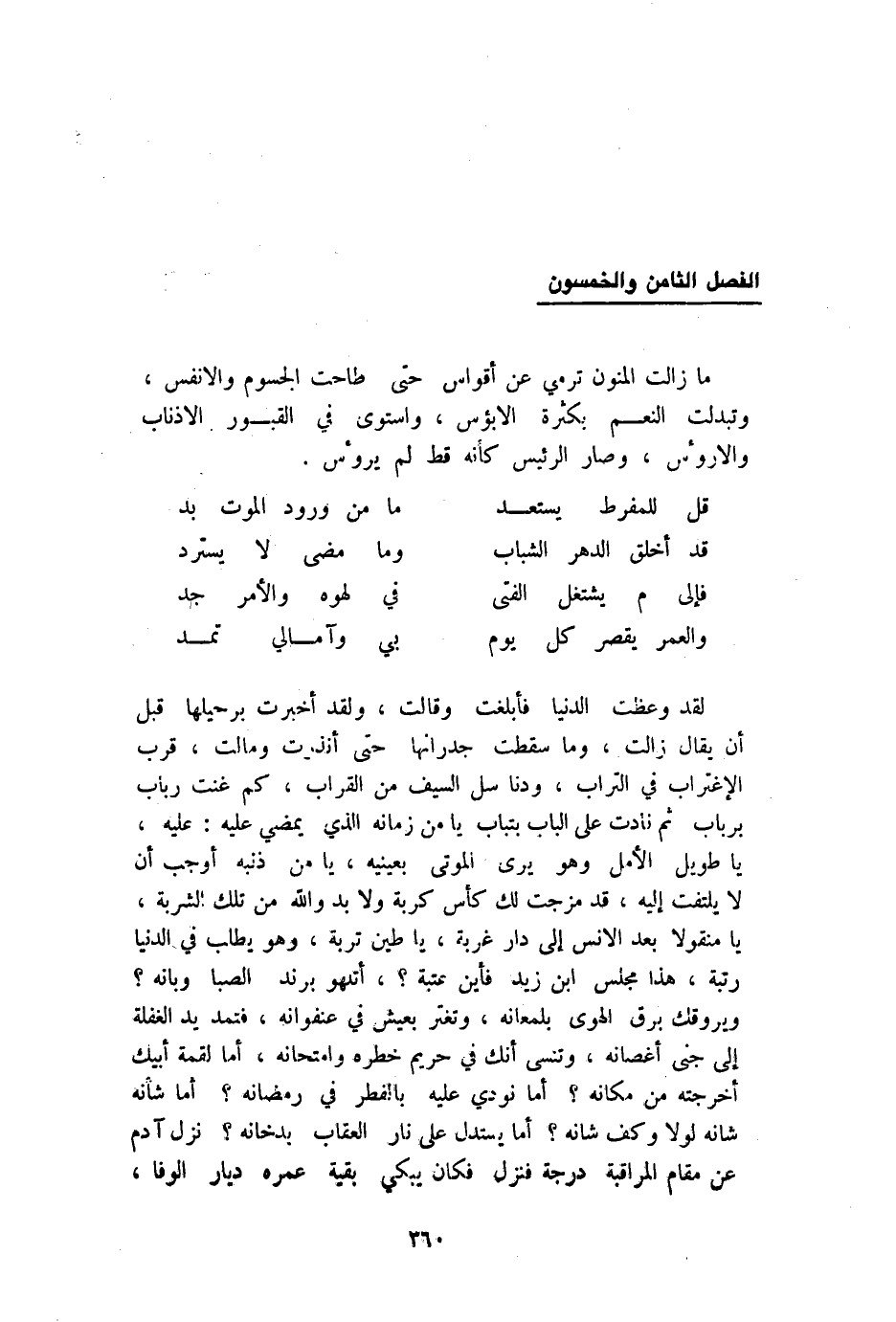 مَا زَالَت الْمنون ترمي عَن أقواس حَتَّى طاحت الجسوم والأنفس وتبدلت النعم بِكَثْرَة الأبؤس واستوى فِي الْقُبُور الأذناب والأرؤس وَصَارَ الرئيس كَأَنَّهُ قطّ لم يرؤس