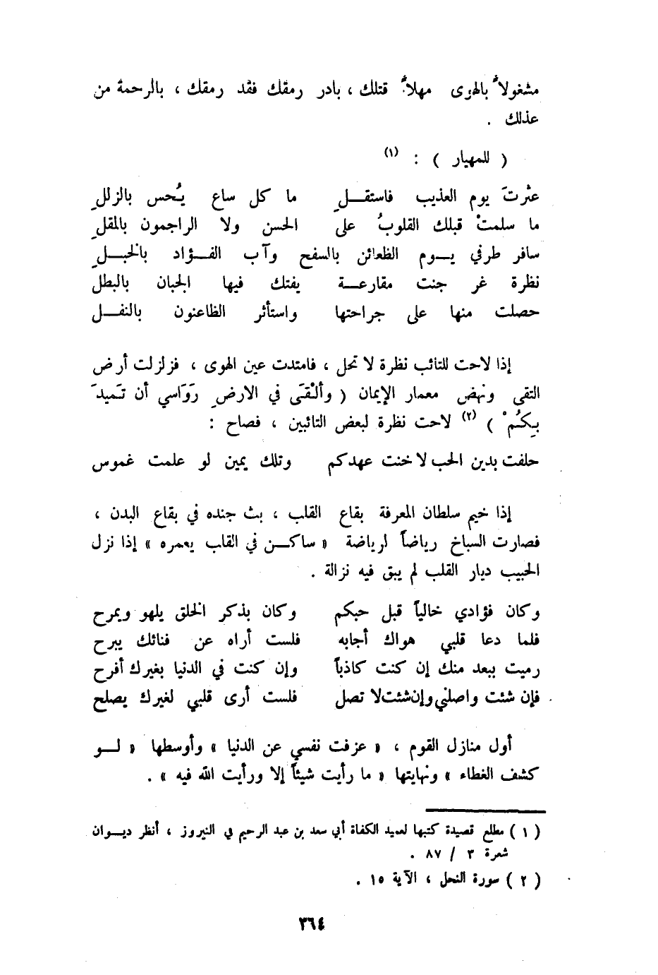 (فَلَمَّا دَعَا قلبِي هَوَاك أَجَابَهُ ... فلست أرَاهُ عَن فنائك يبرح)