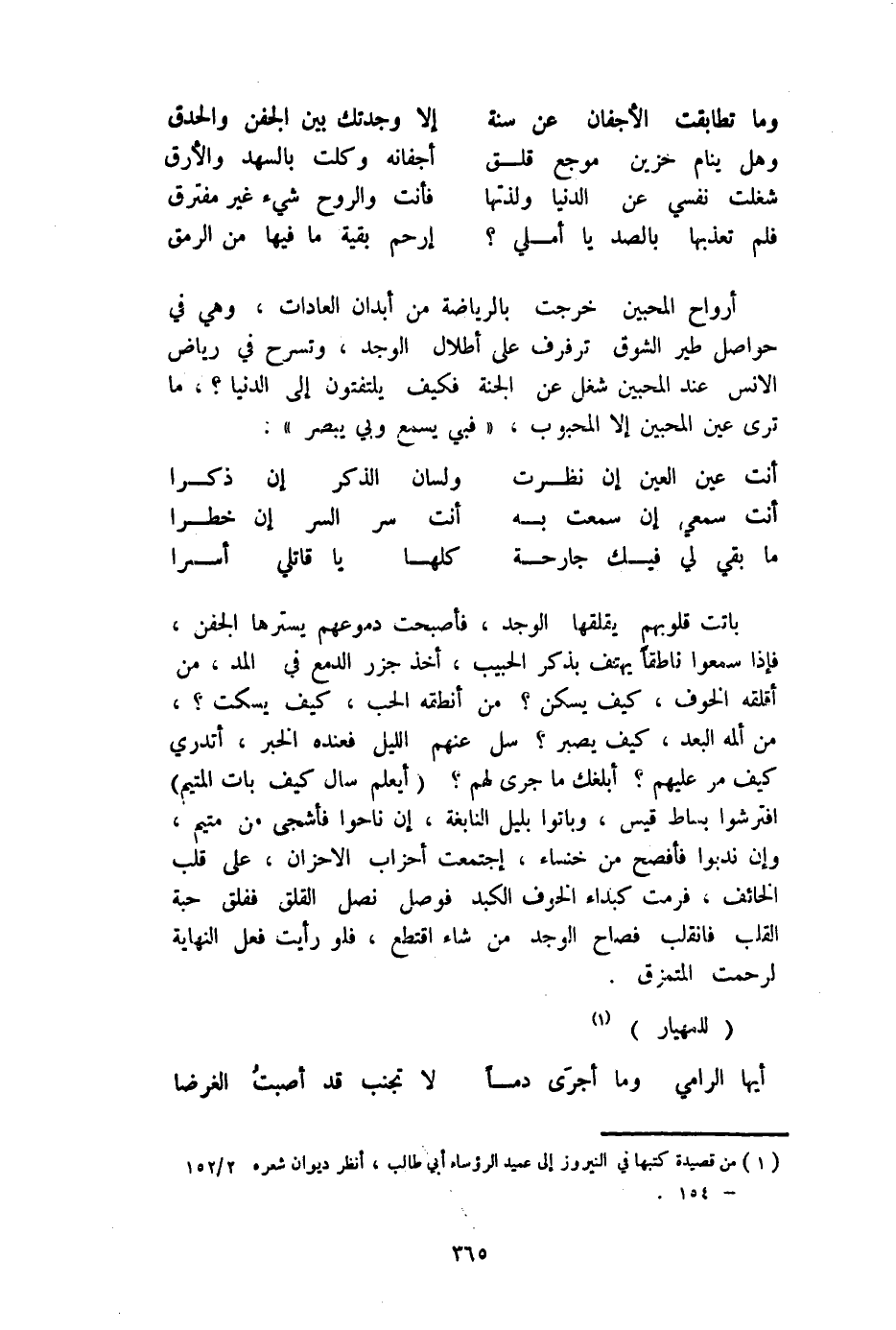 باتت قُلُوبهم يقلقها الوجد فَأَصْبَحت دموعهم يَسْتُرهَا الجفن فَإِذا سمعُوا ناطقا يَهْتِف بِذكر الحبيب أَخذ جزر الدمع فِي الْمَدّ من أقلقه الْخَوْف كَيفَ يسكن من أنطقه الْحبّ كَيفَ يسكت من ألمه الْبعد كَيفَ يصبر سل عَنْهُم اللَّيْل فَعنده الْخَبَر أَتَدْرِي كَيفَ مر عَلَيْهِم أبلغك مَا جرى لَهُم أيعلم سَالَ كَيفَ بَات المتيم افترشوا بِسَاط قيس وَبَاتُوا بلَيْل النَّابِغَة إِن ناحوا فأشجى من متيم وَإِن ندبوا فافصح من خنساء اجْتمعت أحزاب الأحزان على قلب الْخَائِف فرمت كبداء الْخَوْف الكبد فوصل نصل القلق ففلق حَبَّة الْقلب فَانْقَلَبَ فصاح الوجد من شَاءَ اقتطع فَلَو رَأَيْت فعل النِّهَايَة لرحمت المتمزق