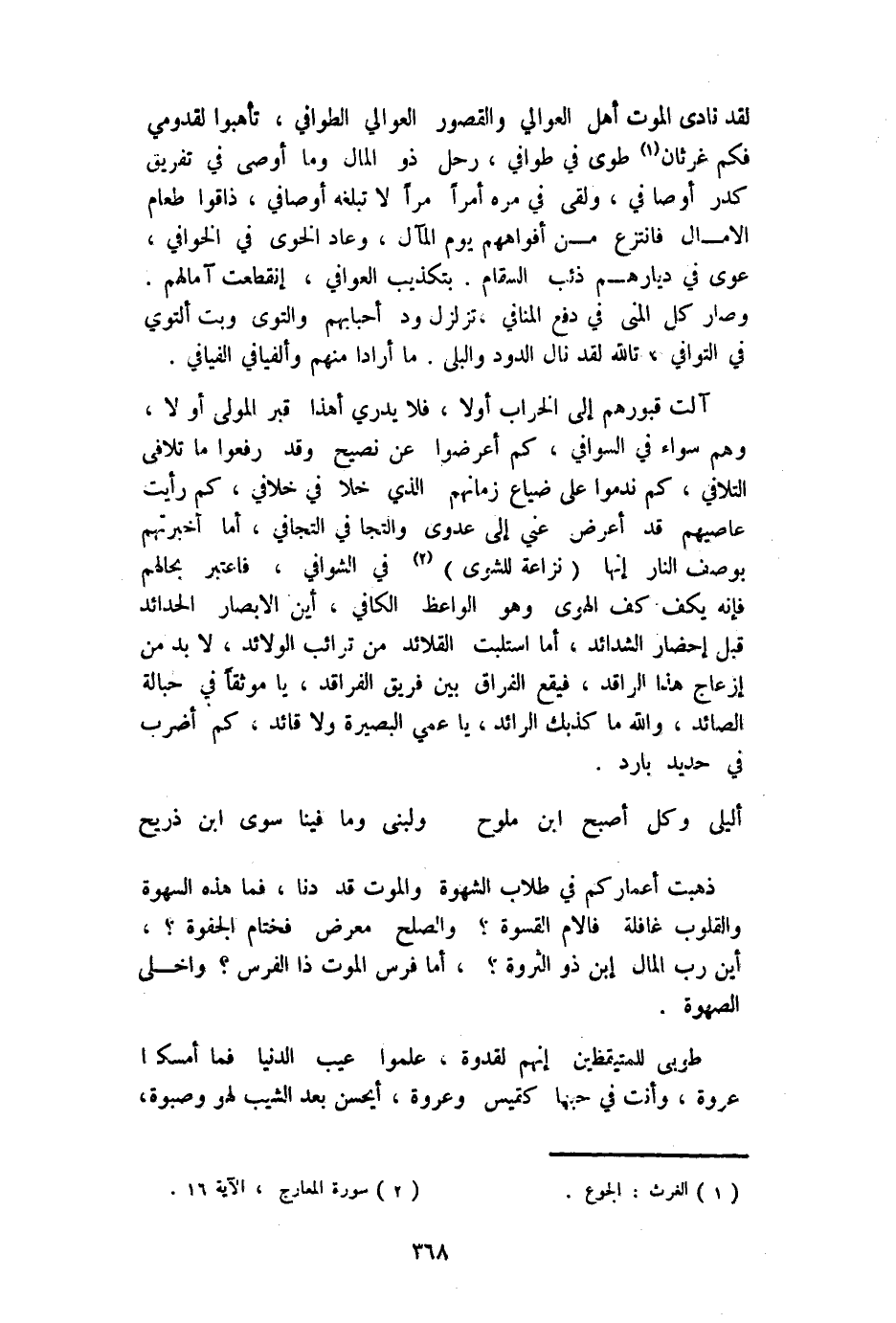 لقد نَادَى الْمَوْت أهل العوالي والقصور العوالي الطوافي تأهبوا لقدومي فكم غرثان طوى فِي طوافي رَحل ذُو المَال وَمَا أوصى فِي تَفْرِيق كدر أوصافي ولقى فِي مره أمرا مرا لَا تبلغه أوصافي ذاقوا طَعَام الأمال فَانْتزع من أَفْوَاههم يَوْم الْمَآل وَعَاد الخوى فِي الخوافي عوى فِي دِيَارهمْ ذِئْب السقام بتكذيب العوافي إنقطعت آمالهم وَصَارَ كل المنى فِي دفع الْمنَافِي تزلزل ود أحبابهم والتوى وَبت ألتوي فِي التوافي تالله لقد نَالَ الدُّود والبلى مَا أَرَادَا مِنْهُم وألفيافي الفيافي