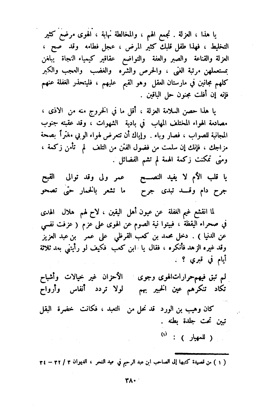 يَا هَذَا حصن السَّلامَة الْعُزْلَة أقل مَا فِي الْخُرُوج مِنْهُ من الْأَذَى مصادمة الْهَوَاء الْمُخْتَلف المهاب فِي بادية الشَّهَوَات وَقد عقبته جنوب المجانبة للصَّوَاب فَصَارَ وباء وَإِيَّاك أَن تتعرض لهواء الوبي مغترا بِصِحَّة مزاجك فَإنَّك إِن سلمت من فضول الْفِتَن من التّلف لم تأمن زكمة وَمَتى تمكنت زكمة الهمة لم تشم الْفَضَائِل