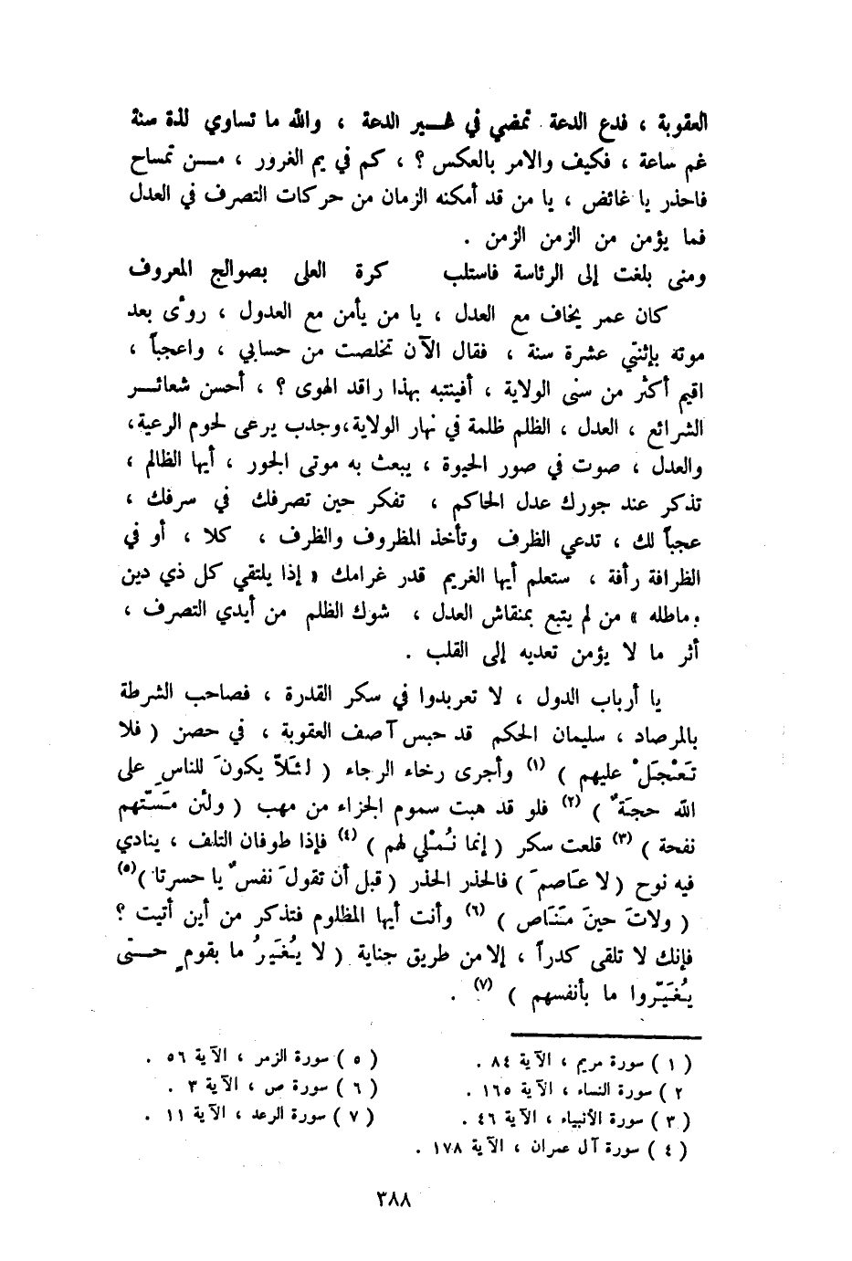 كَانَ عمر يخَاف مَعَ الْعدْل يَا من يَأْمَن مَعَ الْعُدُول رؤى بعد مَوته بإثنتي عشرَة سنة فَقَالَ الْآن تخلصت من حسابي وَاعجَبا أقيم أَكثر من سنى الْولَايَة أفينتبه بِهَذَا رَاقِد الْهوى أحسن شَعَائِر الشَّرَائِع الْعدْل الظُّلم ظلمَة فِي نَهَار الْولَايَة وجدب يرْعَى لُحُوم الرّعية وَالْعدْل صَوت فِي صور الحيوة يبْعَث بِهِ موتى الْجور أَيهَا الظَّالِم تذكر عِنْد جورك عدل الْحَاكِم تفكر حِين تصرفك فِي سرفك عجبا لَك تَدعِي الظّرْف وَتَأْخُذ المظروف والظرف كلا أَو فِي الظرافة رأفة ستعلم أَيهَا الْغَرِيم قدر غرامك إِذا يلتقي كل ذِي دين وماطله من لم يتبع بمنقاش الْعدْل شوك الظُّلم من أَيدي التَّصَرُّف أثر مَا لَا يُؤمن تعديه إِلَى الْقلب
