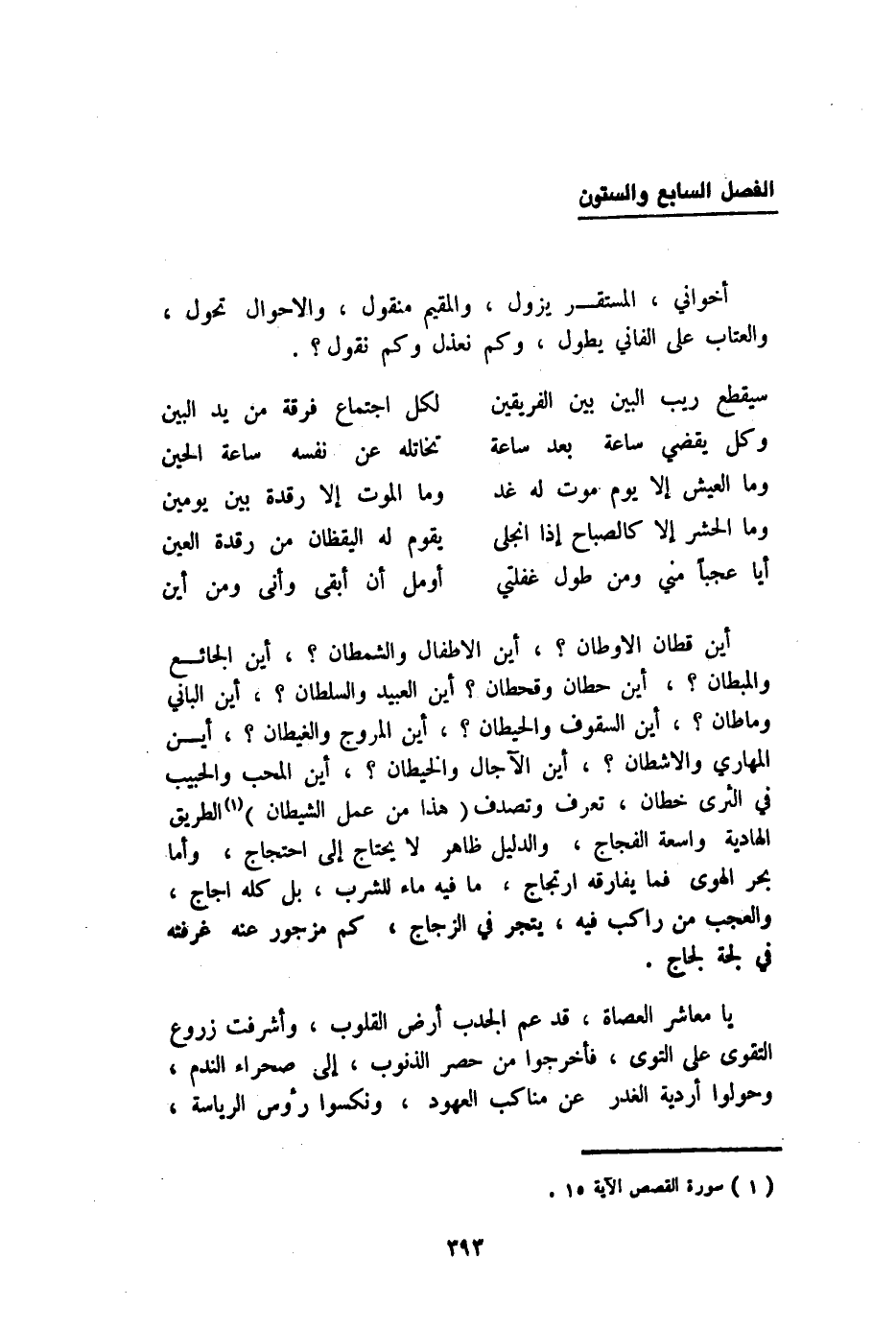 أَيْن قطان الأوطان أَيْن الْأَطْفَال والشمطان أَيْن الجائع والمبطان أَيْن حطَّان وقحطان أَيْن العبيد وَالسُّلْطَان أَيْن الْبَانِي وماطان أَيْن السقوف والحيطان أَيْن المروج والغيطان أَيْن المهاري والأشطان أَيْن الْآجَال والخيطان أَيْن الْمُحب والحبيب فِي الثرى خطان تعرف وتصدف {هَذَا من عمل الشَّيْطَان} الطَّرِيق الهادية وَاسِعَة الفجاج وَالدَّلِيل ظَاهر لَا يحْتَاج إِلَى احتجاج وَأما بَحر الْهوى فَمَا يُفَارِقهُ ارتجاج مَا فِيهِ مَاء للشُّرْب بل كُله أجاج وَالْعجب من رَاكب فِيهِ يتجر فِي الزّجاج كم مزجور عَنهُ غرفته فِي لجة لجاج