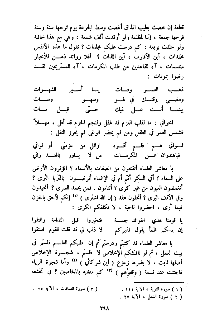 يَا معاشر الْعلمَاء أتقنعون من الصِّفَات بالأسماء أتؤثرون الأَرْض على السَّمَاء أَفِي السكر أَنْتُم ام فِي الْإِغْمَاء أَتَرْضَوْنَ بِالثُّرَيَّا الثرى أتغمضون الْعُيُون من غير كرى أتنامون فَمن يحمد السرى أتحيدون وَفِي الْأنف البرى أتحلون عقد {إِن الله اشْترى} إِنَّكُم لأحق بالحزن فِيمَا أرى احضروا نَاحيَة لَا تكلفكم الْكرَى