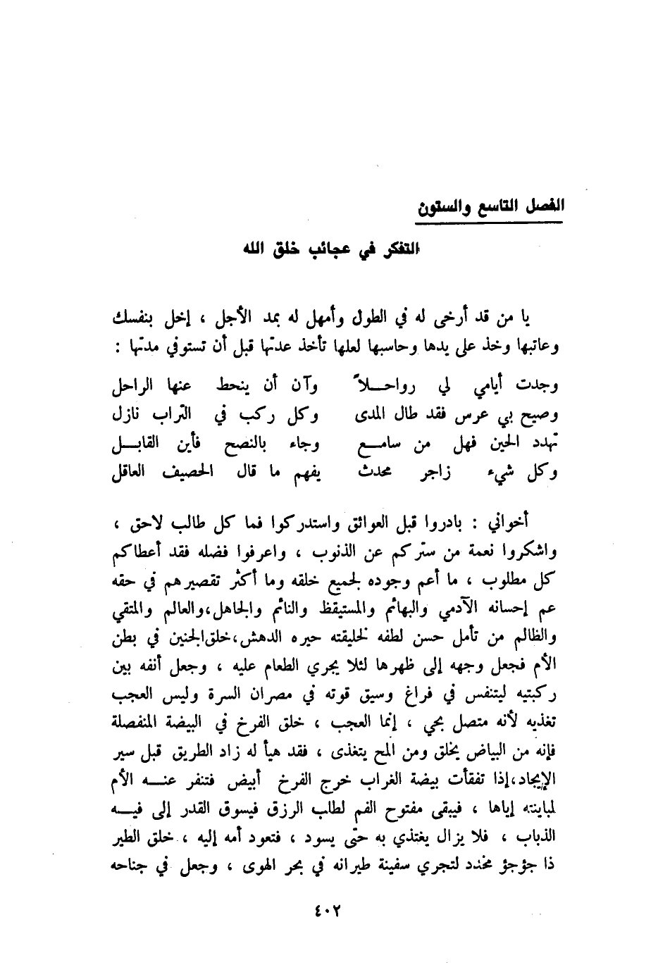أخواني بَادرُوا قبل الْعَوَائِق واستدركوا فَمَا كل طَالب لَاحق واشكروا نعْمَة من ستركم عَن الذُّنُوب واعرفوا فَضله فقد أَعْطَاكُم كل مَطْلُوب مَا أَعم وجوده لجَمِيع خلقه وَمَا اكثر تقصيرهم فِي حَقه عَم إحسانه الْآدَمِيّ والبهائم والمستيقظ والنائم وَالْجَاهِل والعالم والمتقي والظالم من تَأمل حسن لطفه لخليقته حيره الدهش خلق الْجَنِين فِي بطن الْأُم فَجعل وَجهه إِلَى ظهرهَا لِئَلَّا يجْرِي الطَّعَام عَلَيْهِ وَجعل أَنفه بَين رُكْبَتَيْهِ ليتنفس فِي فرَاغ وسيق قوته فِي مصران السُّرَّة وَلَيْسَ الْعجب تغذيه لِأَنَّهُ مُتَّصِل بحي إِنَّمَا الْعجب خلق الفرخ فِي الْبَيْضَة الْمُنْفَصِلَة فَإِنَّهُ من الْبيَاض يخلق وَمن المح يتغذى فقد هيأ لَهُ زَاد الطَّرِيق قبل سير الإيجاد إِذا تفقأت بَيْضَة الْغُرَاب خرج الفرخ أَبيض فتنفر عَنهُ الْأُم لمباينته إِيَّاهَا فَيبقى مَفْتُوح الْفَم لطلب الرزق فيسوق الْقدر إِلَى فِيهِ الذُّبَاب فَلَا يزَال يغتذي بِهِ حَتَّى يسود فتعود أمه إِلَيْهِ خلق الطير ذَا جؤجؤ مخدد لتجري سفينة طيرانه فِي بَحر الْهوى وَجعل فِي جنَاحه