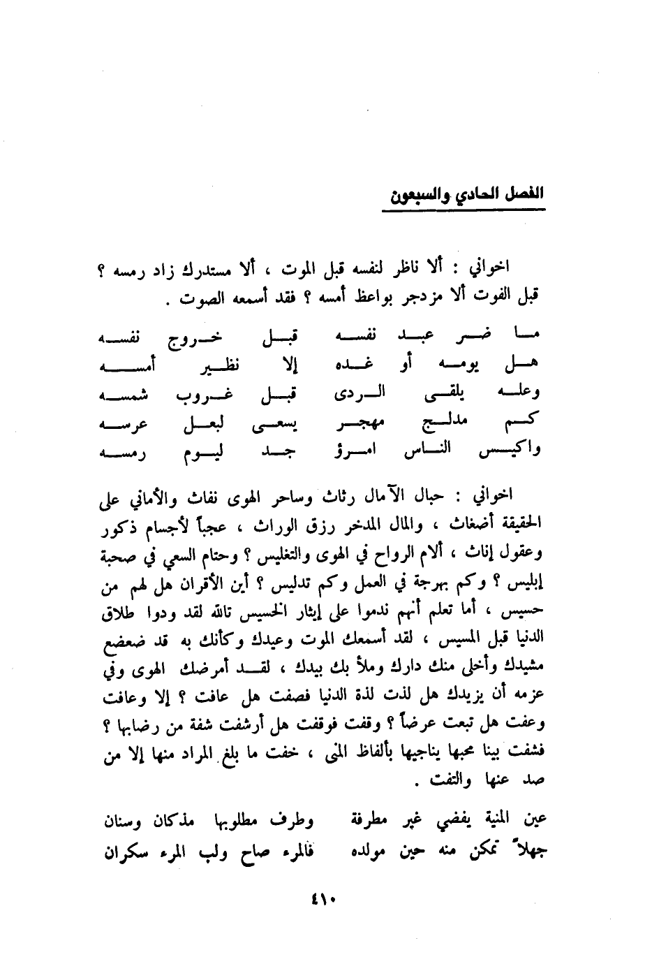 أخواني أَلا نَاظر لنَفسِهِ قبل الْمَوْت أَلا مُسْتَدْرك زَاد رمسه قبل الْفَوْت أَلا مزدجر بواعظ أمسه فقد أسمعهُ الصَّوْت