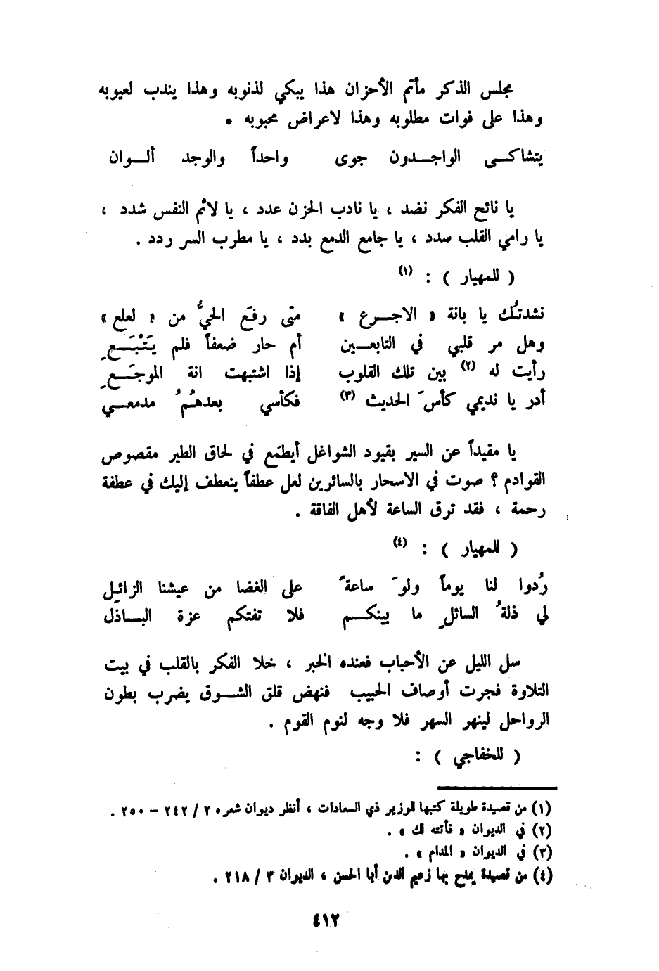 يَا نائح الْفِكر نضد يَا نادب الْحزن عدد يَا لائم النَّفس شدد يَا رامي الْقلب سدد يَا جَامع الدمع بدد يَا مطرب السِّرّ ردد
