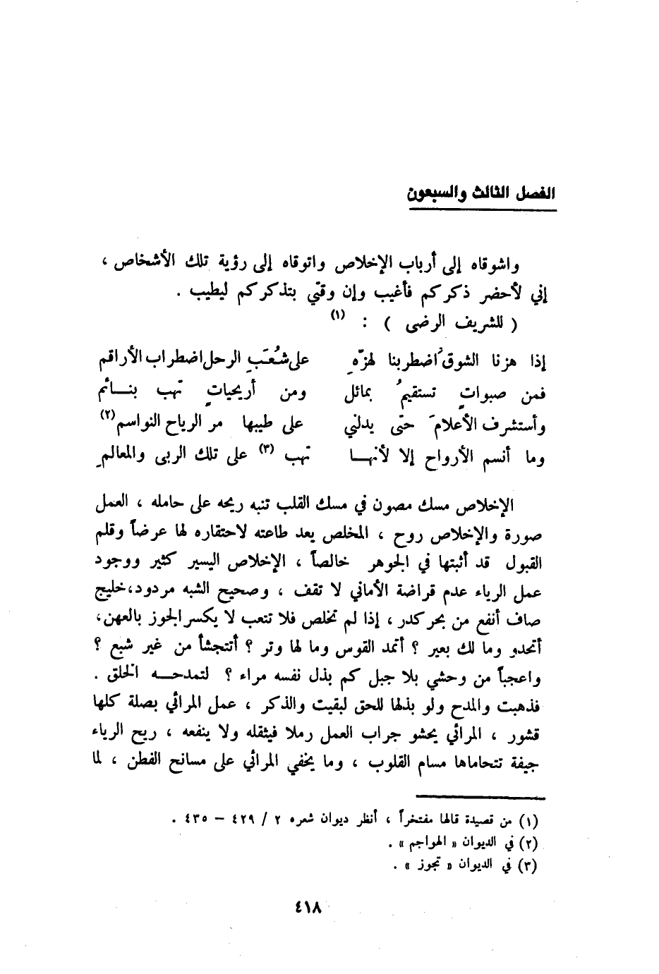 الْإِخْلَاص مسك مصون فِي مسك الْقلب تنبه رِيحه على حامله الْعَمَل صُورَة وَالْإِخْلَاص روح المخلص يعد طَاعَته لاحتقاره لَهَا عرضا وقلم الْقبُول قد أثبتها فِي الْجَوْهَر خَالِصا الْإِخْلَاص الْيَسِير كثير وَوُجُود عمل الرِّيَاء عدم قراضة الْأَمَانِي لَا تقف وصحيح الشّبَه مَرْدُود خليج صَاف أَنْفَع من بَحر كدر إِذا لم تخلص فَلَا تتعب لَا يكسر الْجَوْز بالعهن أتحدو وَمَا لَك بعير أتمد الْقوس وَمَا لَهَا وتر أتتجشأ من غير شبع وَاعجَبا من وَحشِي بِلَا جبل كم بذل نَفسه مراء لتمدحه الْخلق فَذَهَبت والمدح وَلَو بذلها للحق لبقيت وَالذكر عمل الْمرَائِي بصلَة كلهَا قشور الْمرَائِي يحشو جراب الْعَمَل رملا فيثقله وَلَا يَنْفَعهُ ريح الرِّيَاء جيفة تتحاماها مسام الْقُلُوب وَمَا يخفى الْمرَائِي على مسانح الفطن لما