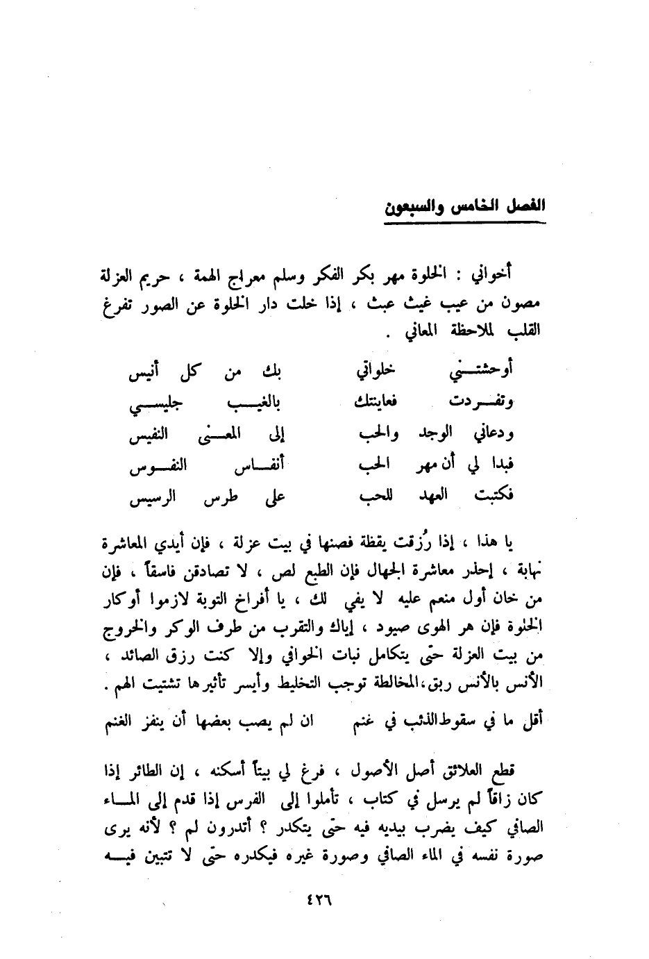 أخواني الْخلْوَة مهر بكر الْفِكر وَسلم مِعْرَاج الهمة حَرِيم الْعُزْلَة مصون من عيب غيث عَبث إِذا خلت دَار الْخلْوَة عَن الصُّور تفرغ الْقلب لملاحظة الْمعَانِي