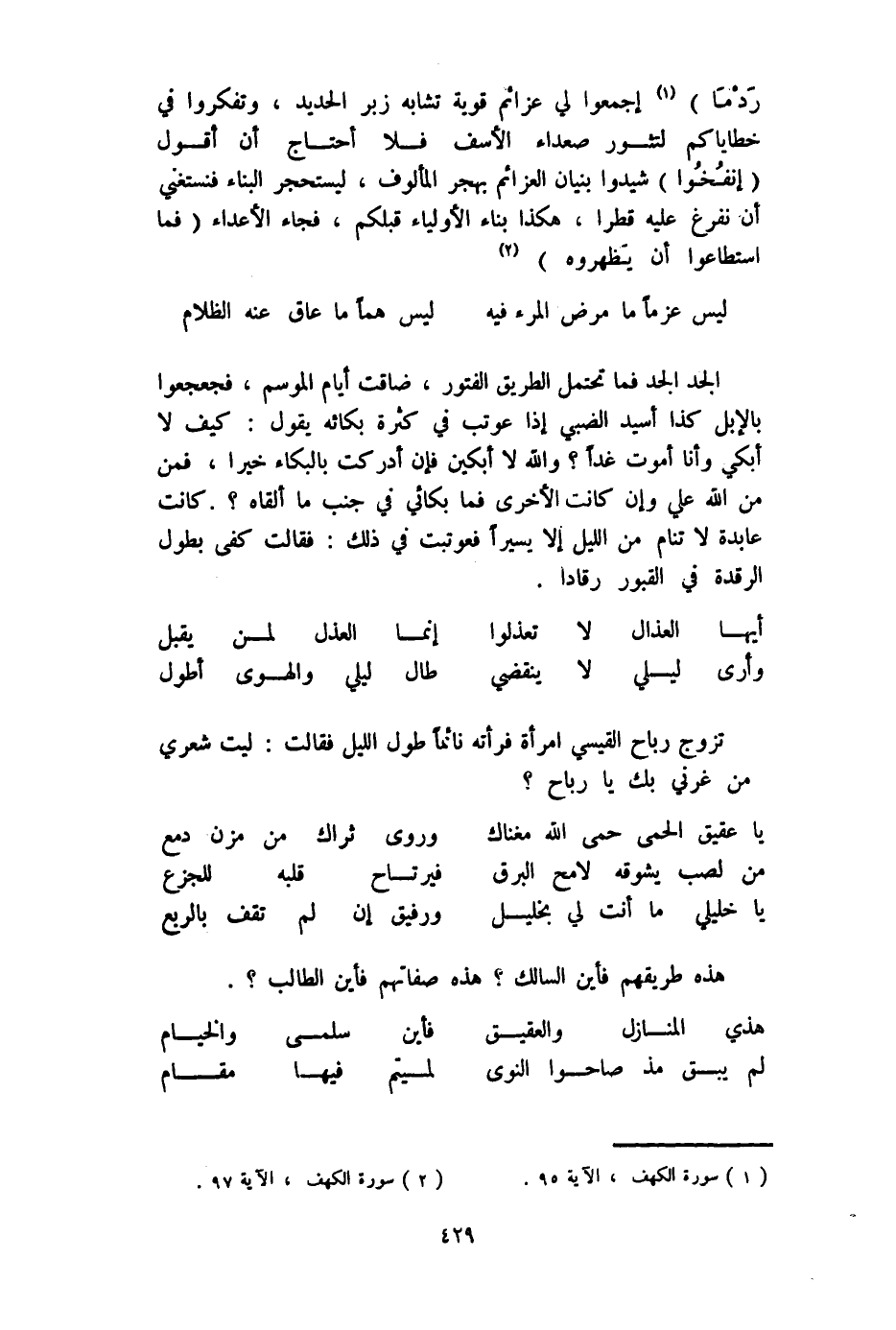 الْجد الْجد فَمَا تحْتَمل الطَّرِيق الفتور ضَاقَتْ أَيَّام الْمَوْسِم فجعجعوا بِالْإِبِلِ كَذَا أسيد الضَّبِّيّ إِذا عوتب فِي كَثْرَة بكائه يَقُول كَيفَ لَا أبْكِي وَأَنا أَمُوت غَدا وَالله لَا أبكين فَإِن أدْركْت بالبكاء خيرا فَمن من الله عَليّ وَإِن كَانَت الْأُخْرَى فَمَا بُكَائِي فِي جنب مَا أَلْقَاهُ كَانَت عابدة لَا تنام من اللَّيْل إِلَّا يَسِيرا فوتبت فِي ذَلِك فَقَالَت كفى بطول الرقدة فِي الْقُبُور رقادا