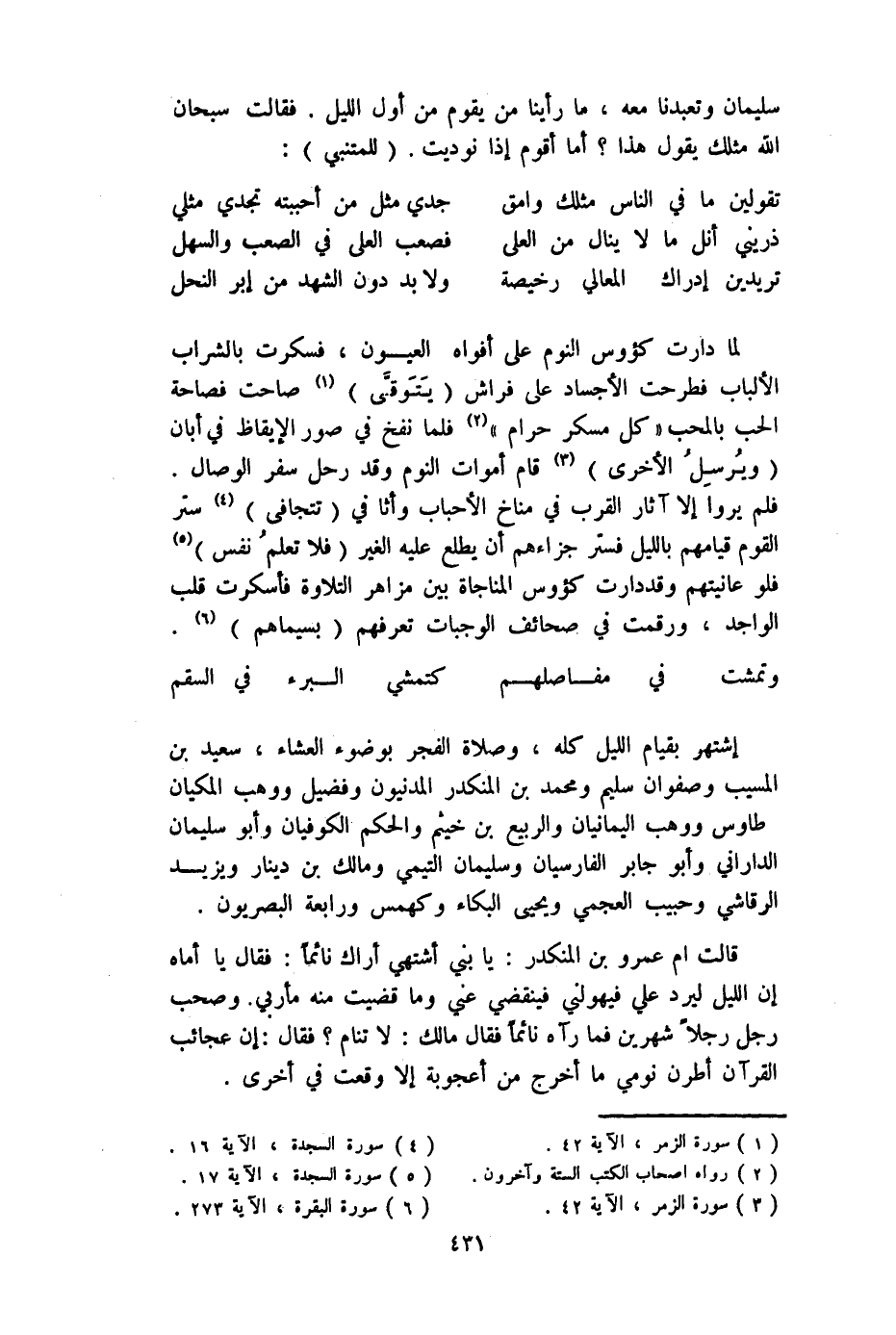 قَالَت أم عَمْرو بن الْمُنْكَدر يَا بني أشتهي أَرَاك نَائِما فَقَالَ يَا أُمَّاهُ إِن اللَّيْل ليرد عَليّ فيهولني فينقضي عني وَمَا قضيت مِنْهُ مأربي وَصَحب رجل رجلا شَهْرَيْن فَمَا رَآهُ نَائِما فَقَالَ مَالك لَا تنام فَقَالَ إِن عجائب الْقُرْآن أطرن نومي مَا أخرج من أعجوبة إِلَّا وَقعت فِي أُخْرَى