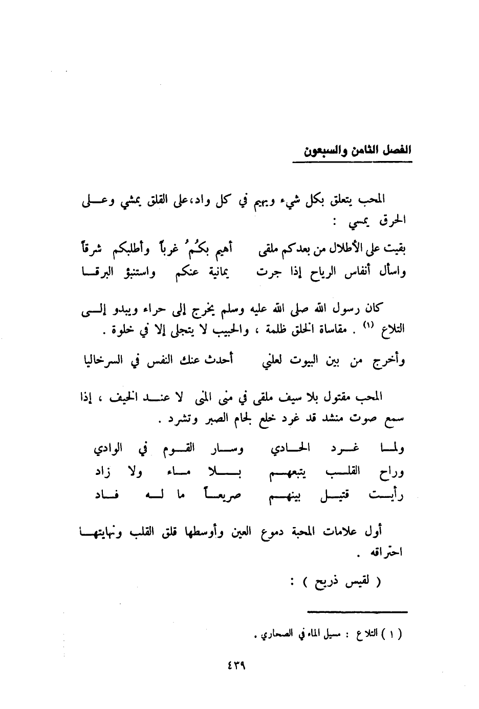 الْمُحب مقتول بِلَا سيف ملقى فِي منى المنى لَا عِنْد الْخيف إِذا سمع صَوت منشد قد غرد خلع لجام الصَّبْر وتشرد