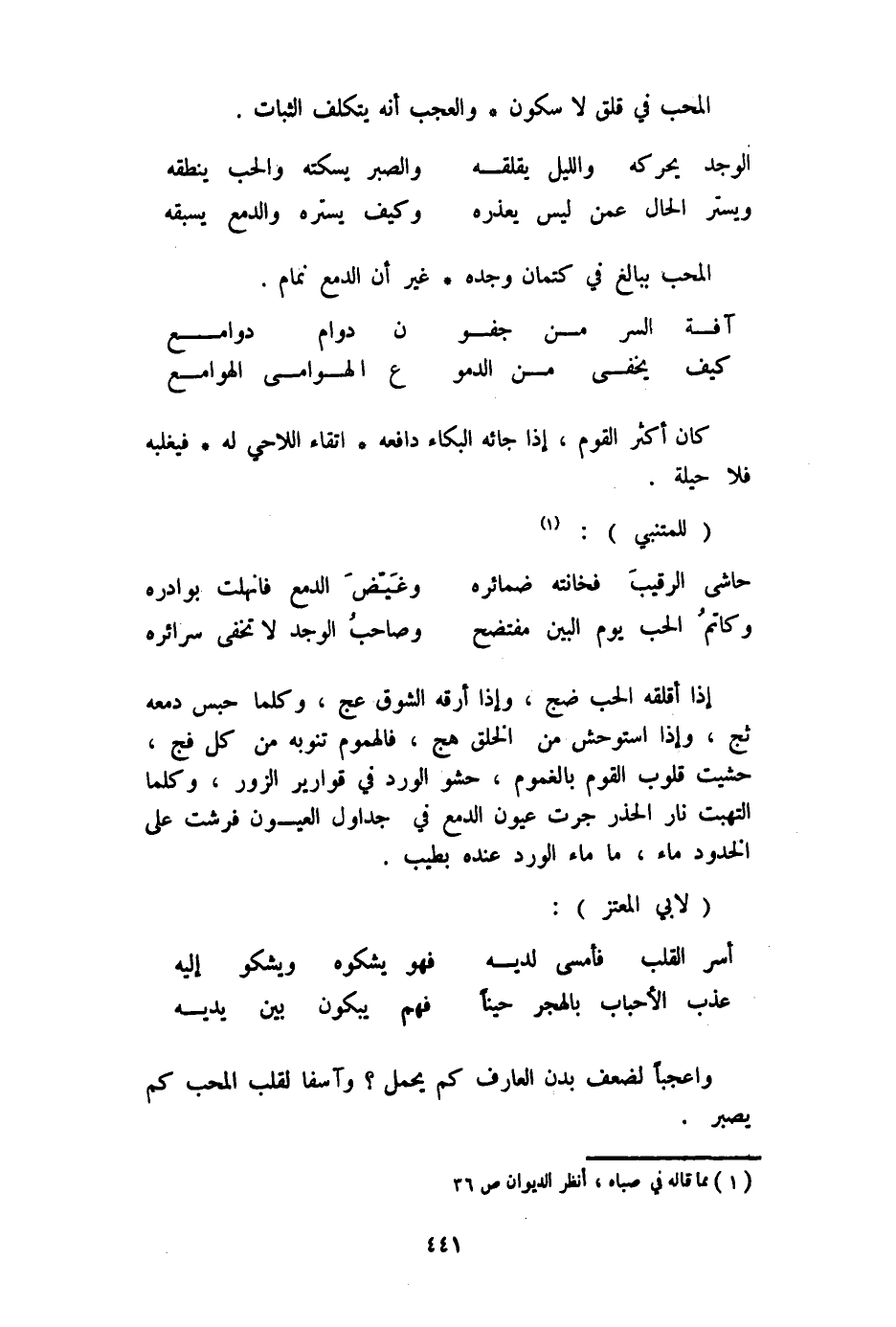 (الوجد يحركه وَاللَّيْل يقلقه ... وَالصَّبْر يسكته وَالْحب ينطقه)
