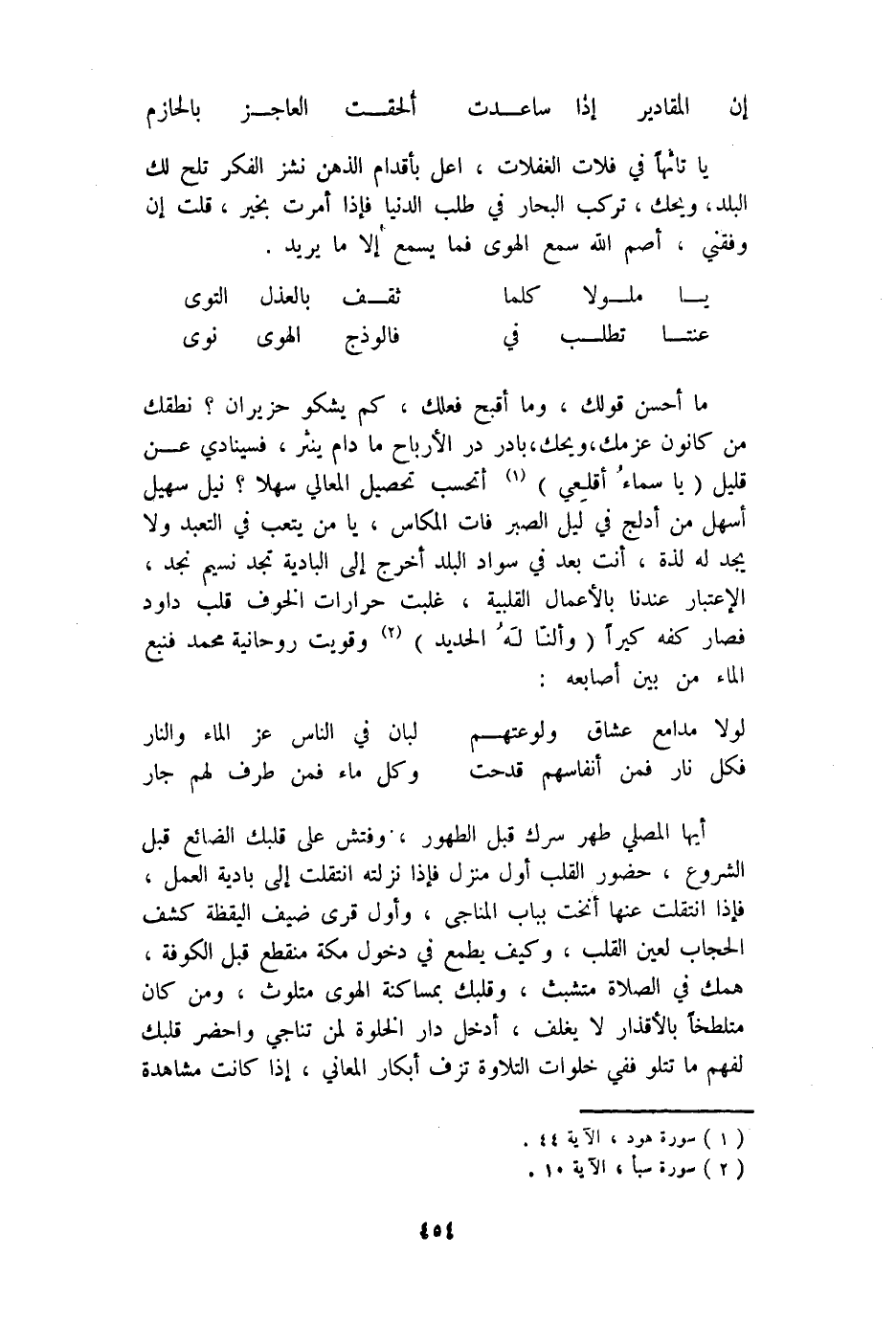 مَا أحسن قَوْلك وَمَا أقبح فعلك كم يشكو حزيران نطقك من كانون عزمك وَيحك بَادر در الأرباح مَا دَامَ ينثر فسينادي عَن قَلِيل {وَيَا سَمَاء أقلعي} أتحسب تَحْصِيل الْمَعَالِي سهلا نيل سُهَيْل أسهل من أدْلج فِي ليل الصَّبْر فَاتَ المكاس يَا من يتعب فِي التَّعَبُّد وَلَا يجد لَهُ لَذَّة أَنْت بعد فِي سَواد الْبَلَد أخرج إِلَى الْبَادِيَة تَجِد نسيم نجد الإعتبار عندنَا بِالْأَعْمَالِ القلبية غلبت حرارات الْخَوْف قلب دَاوُد فَصَارَ كَفه كيرا {وألنا لَهُ الْحَدِيد} وقويت روحانية مُحَمَّد فنبع المَاء من بَين أَصَابِعه