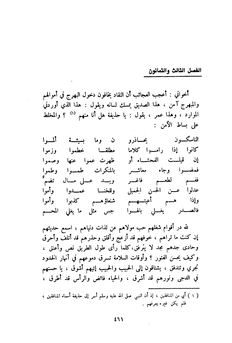 لله در أَقوام شغلهمْ حب مَوْلَاهُم عَن لذات دنياهم اسْمَع حَدِيثهمْ إِن كنت مَا تراهم خوفهم قد أزعج وأقلق وحذرهم قد أتلف وأحرق وحادى جدهم مجد لَا يترفق كلما رأى طول الطَّرِيق نَص وأعنق وَكَيف يحسن الفتور وأوقات السَّلامَة تسرق دموعهم فِي أَنهَار الخدود تجْرِي وتتدفق يشتاقون إِلَى الحبيب والحبيب إِلَيْهِم أشوق يَا حسنهم فِي الدجى ونورهم قد أشرق وَالْحيَاء فائض وَالرَّأْس قد أطرق