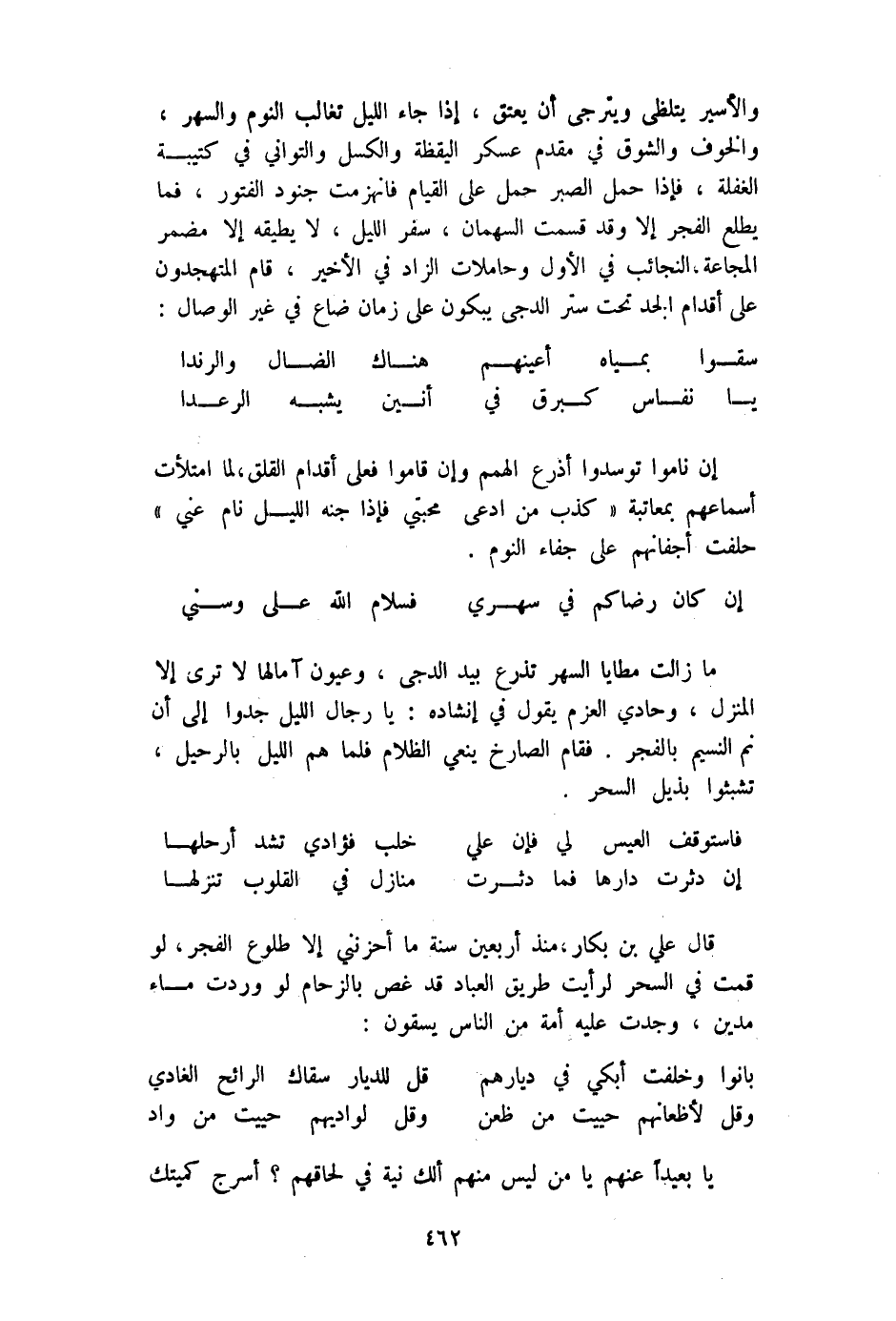 مَا زَالَت مطايا السهر تذرع بيد الدجى وعيون آمالها لَا ترى إِلَّا الْمنزل وحادي الْعَزْم يَقُول فِي إنشاده يَا رجال اللَّيْل جدوا إِلَى أَن نم النسيم بِالْفَجْرِ فَقَامَ الصَّارِخ ينعي الظلام فَلَمَّا هم اللَّيْل بالرحيل تشبثوا بذيل السحر
