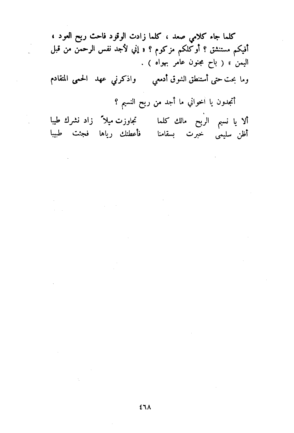 كلما جَاءَ كَلَامي صعد كلما زَادَت الْوقُود فاحت ريح الْعود أفيكم مستنشق أَو كلكُمْ مزكوم إِنِّي لآجد نفس الرَّحْمَن من قبل الْيمن باح مَجْنُون عَامر بهواه