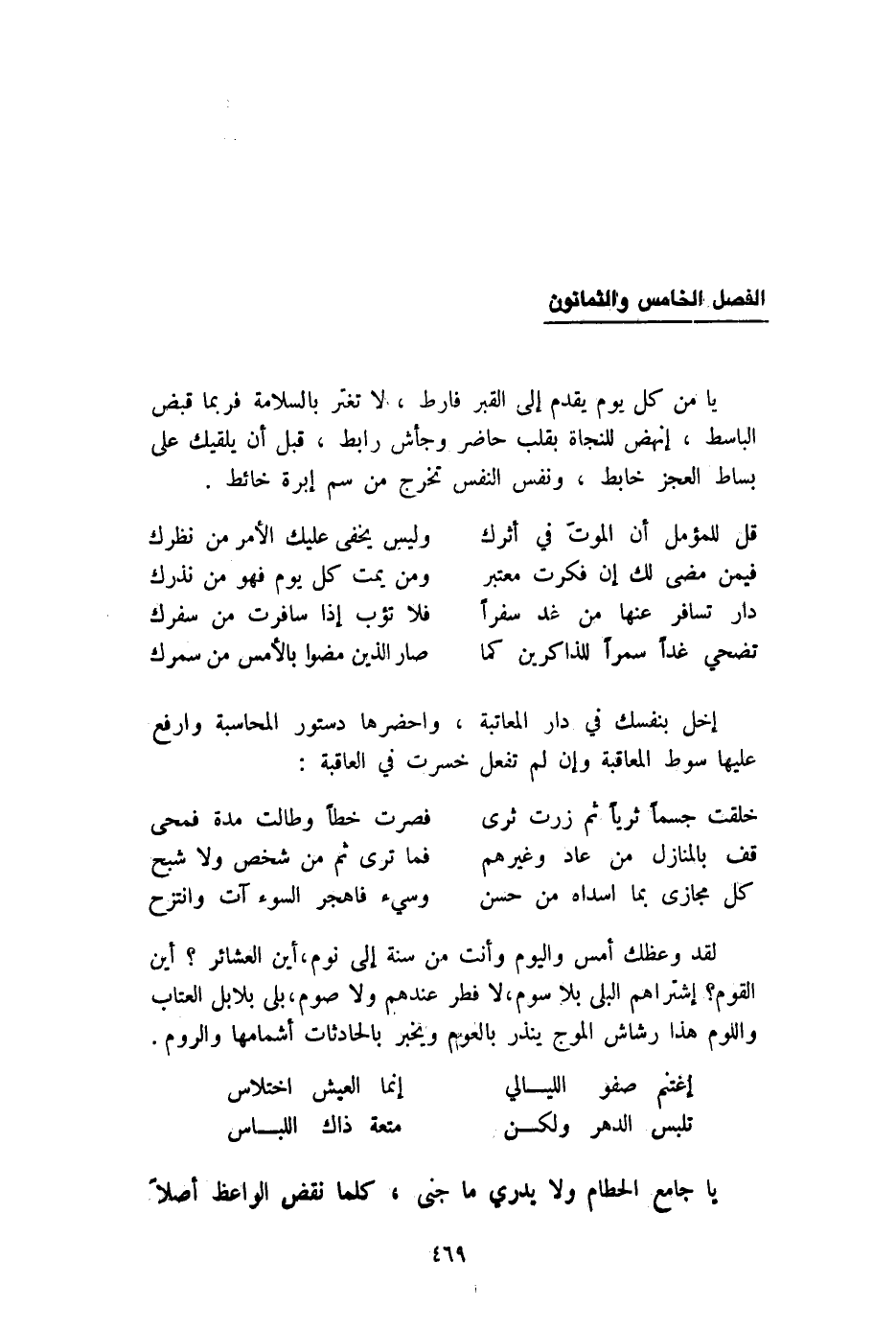 لقد وعظك أمس وَالْيَوْم وَأَنت من سنة إِلَى نوم أَيْن العشائر أَيْن الْقَوْم إشتراهم البلى بِلَا سوم لَا فطر عِنْدهم وَلَا صَوْم بلَى بلابل العتاب واللوم هَذَا رشاش الموج ينذر بالعوم ويخبر بالحادثات أشمامها وَالروم