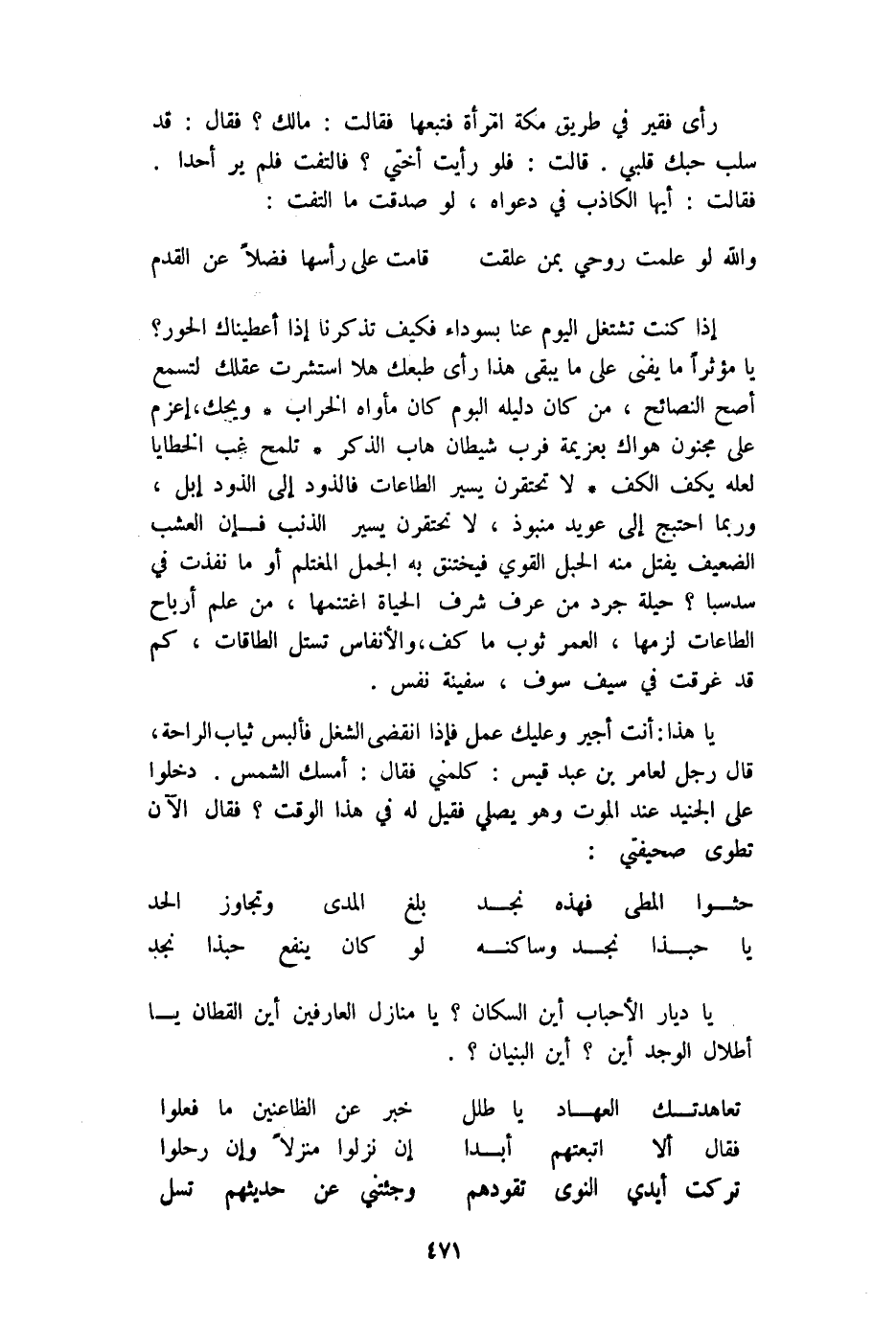 رأى فَقير فِي طَرِيق مَكَّة امْرَأَة فتبعها فَقَالَت مَالك فَقَالَ قد سلب حبك قلبِي قَالَت فَلَو رَأَيْت أُخْتِي فَالْتَفت فَلم ير أحدا فَقَالَت أَيهَا الْكَاذِب فِي دَعْوَاهُ لَو صدقت مَا الْتفت