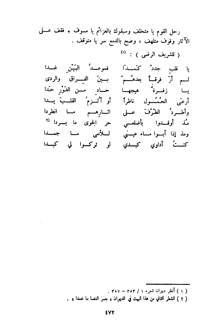 رَحل الْقَوْم يَا متخلف وسبقوك بالعزائم يَا مسوف فقف على الْآثَار وقُوف متلهف وَصَحَّ بالدمع سر يَا مُتَوَقف