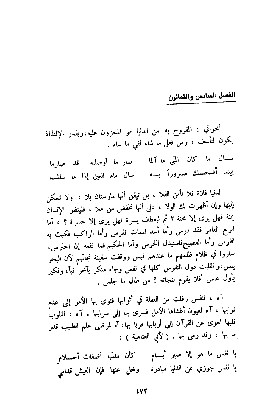 آه لنَفس رفلت من الْغَفْلَة فِي أثوابها فثوى بهَا الْأَمر إِلَى عدم ثَوَابهَا آه لعيون أغشاها الأمل فسرى بهَا إِلَى سرابها آه لقلوب قَلبهَا الْهوى عَن الْقُرْآن إِلَى أَرْبَابهَا فربا بهَا آه لمرضى علم الطَّبِيب قدر مَا بهَا وَقد رمى بهَا لأبي الْعَتَاهِيَة