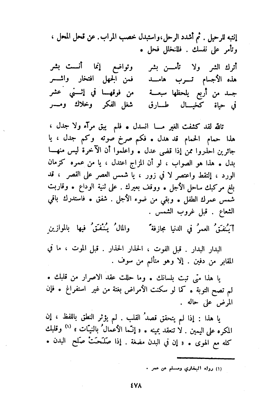 تالله لقد كشفت الْغَيْر مَا انسدل فَلم يبْق مرآء وَلَا جدل هَذَا حمام الْحمام قد هدل فكم صرخَ صَوته وَكم جدل يَا جائرين احْذَرُوا مِمَّن إِذا قضى عدل وَاعْلَمُوا أَن الْآخِرَة لَيْسَ مِنْهَا بدل هَذَا هُوَ الصَّوَاب لَو أَن المزاج اعتدل يَا من عمره كزمان الْورْد إلتقط واعتصر لَا فِي زور يَا شمس الْعَصْر على الْقصر قد بلغ مركبك سَاحل الْأَجَل ووقف بعيرك على ثنية الْوَدَاع وقاربت شمس عمرك الطِّفْل وَبَقِي من ضوء الْأَجَل شفق فاستدرك بَاقِي الشعاع قبل غرُوب الشَّمْس