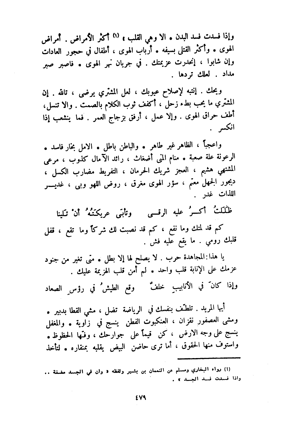 وَإِذا فَسدتْ فسد الْبدن أَلا وَهِي الْقلب أَكثر الْأَمْرَاض أمراض الْهوى وَأكْثر الْقَتْلَى بِسَيْفِهِ أَرْبَاب الْهوى أَطْفَال فِي حجور الْعَادَات وَإِن شابوا انحدرت عزيمتك فِي جَرَيَان نهر الْهوى فاصبر صَبر مداد لَعَلَّك تردها