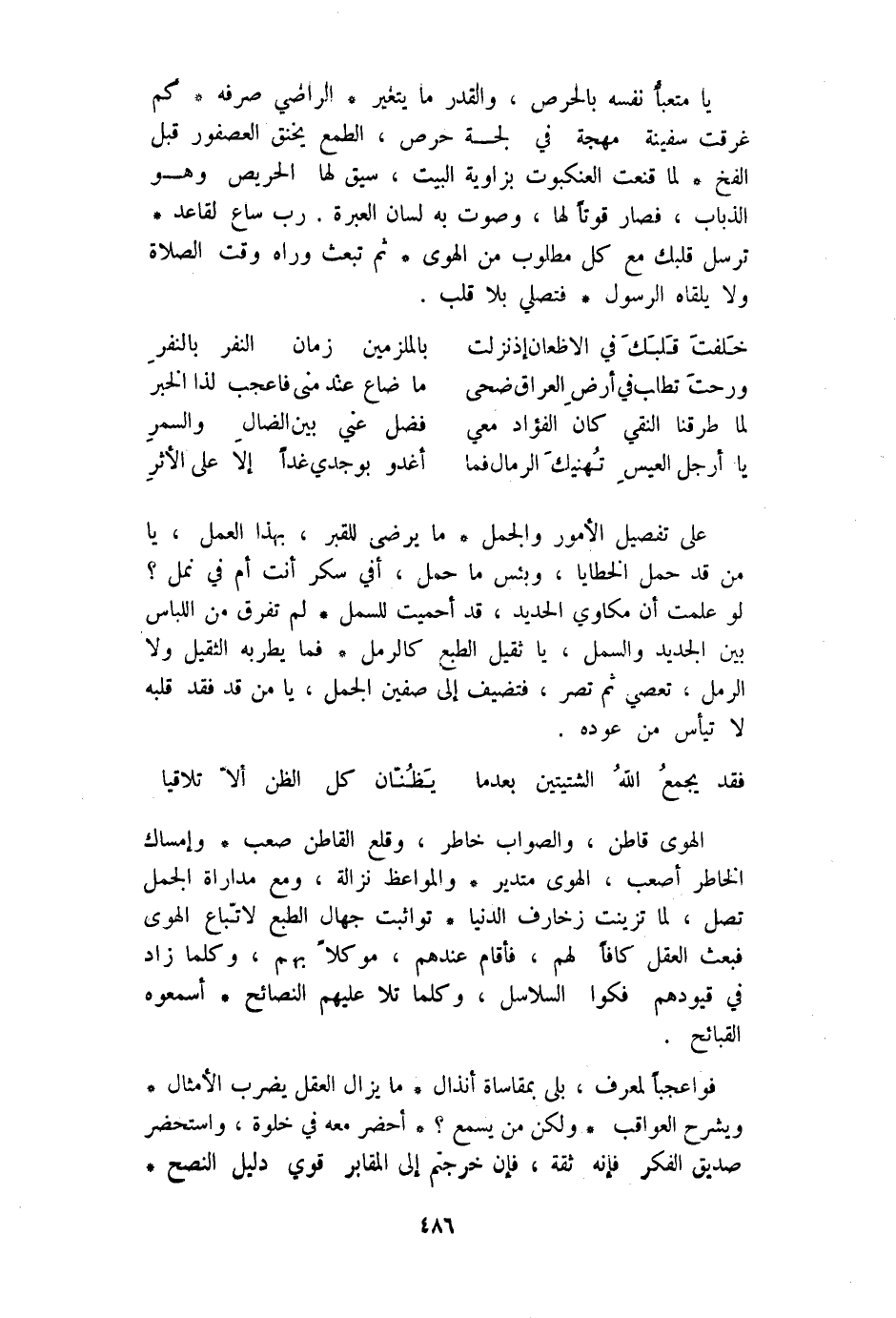 يَا متعبا نَفسه بالحرص وَالْقدر مَا يتَغَيَّر الراضي صرفه كم غرقت سفينة مهجة فِي لجة حرص الطمع يخنق العصفور قبل الفخ لما قنعت العنكبوت بزاوية الْبَيْت سيق لَهَا الْحَرِيص وَهُوَ الذُّبَاب فَصَارَ قوتا لَهَا وَصَوت بِهِ لِسَان الْعبْرَة رب ساع لقاعد ترسل قَلْبك مَعَ كل مَطْلُوب من الْهوى ثمَّ تبْعَث وَرَاه وَقت الصَّلَاة وَلَا يلقاه الرَّسُول فَتُصَلِّي بِلَا قلب