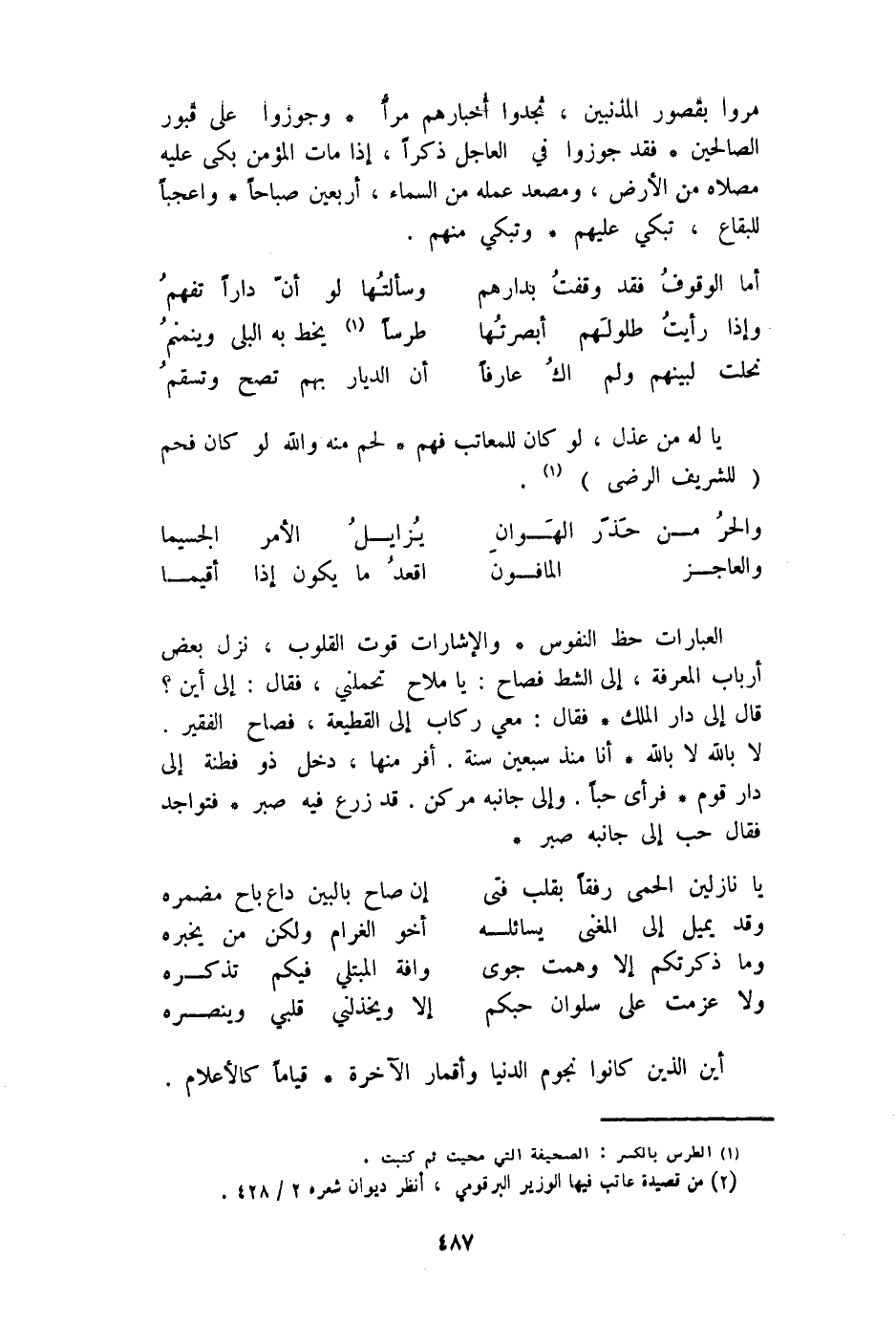 مروا بقصور المذنبين تَجدوا أخبارهم مرا وجوزوا على قُبُور الصَّالِحين فقد جوزوا فِي العاجل ذكرا إِذا مَاتَ الْمُؤمن بَكَى عَلَيْهِ مُصَلَّاهُ من الأَرْض ومصعد عمله من السَّمَاء أَرْبَعِينَ صباحا وَاعجَبا للبقاع تبْكي عَلَيْهِم وتبكي مِنْهُم