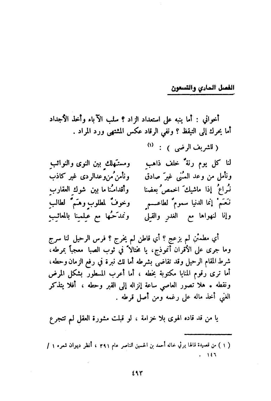 أخواني أما يُنَبه على استعداد الزَّاد سلب الْآبَاء وَأخذ الأجداد أما يُحَرك إِلَى التيقظ وَنفي الرقاد عكس المشتهى ورد المُرَاد
