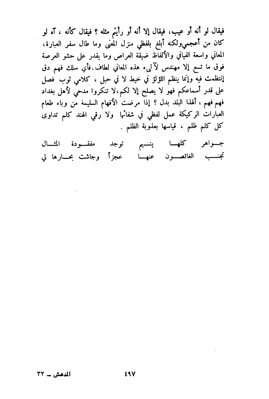 فَيُقَال لَو أَنه أَو عيب فَيُقَال إِلَّا أَنه أَو رَأَيْتُمْ مثله فَيُقَال كَأَنَّهُ آه لَو كَانَ من أعجمي وَلكنه أبلغ بلفظي منزل الْمَعْنى وَمَا طَال سفر الْعبارَة الْمعَانِي وَاسِعَة الفيافي والألفاظ ضيقَة العراص وَمَا يقدر على حَشْو الْعَرَصَة فَوق مَا تسع إِلَّا مهندس لآلئ هَذِه الْمعَانِي لطاف فَأَي سلك فهم دق إنتظمت فِيهِ وَإِنَّمَا ينظم اللُّؤْلُؤ فِي خيط لَا فِي حَبل كَلَامي ثوب فصل على قدر أسماعكم فَهُوَ لَا يصلح إِلَّا لكم لَا تنكروا مدحي لأهل بَغْدَاد فهم فهم أَلِهَذَا الْبَلَد بدل إِذا مَرضت الأفهام السليمة من وباء طَعَام الْعبارَات الرَّكِيكَة عمل لَفْظِي فِي شفائها وَلَا رقي الْهِنْد كلم تداوى كل كلم ظلم قياسها بعذوبة الظُّلم