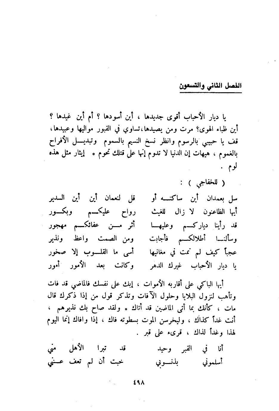 يَا ديار الأحباب أقوى جديدها أَيْن أسودها أم أَيْن غيدها أَيْن ظباء الْهوى مرت وَمن يصيدها تَسَاوِي فِي الْقُبُور مواليها وعبيدها قف يَا حَبِيبِي بالرسوم وَانْظُر نسخ النسيم بالسموم وتبديل الأفراح بالغموم هَيْهَات إِن الدُّنْيَا لَا تدوم إِنَّهَا على قَتلك تحوم إِيثَار مثل هَذِه لوم