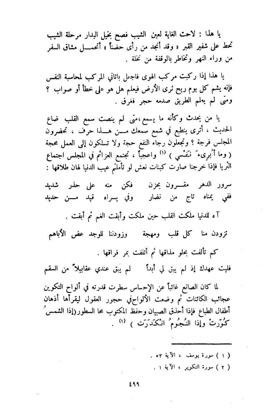 يَا هَذَا لاحت الْغَايَة لعين الشيب فصح بخيل البدار مرحلة الشيب تحط على شَفير الْقَبْر وَقد أنجد من رأى حضنا أتحمل مشاق السّفر من وَرَاء النَّهر وتخاطر بالوقفة من نَخْلَة