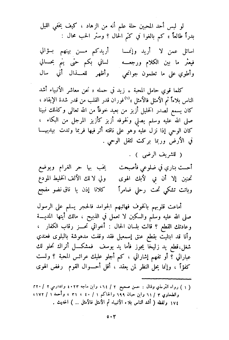 لَو لبس أحد المحبين حلَّة علم أَنه من الزهاد كَيفَ يخفي اللَّيْل بَدْرًا طالعا كم بالغوا فِي كتم الْحَال وَستر الْحبّ محَال