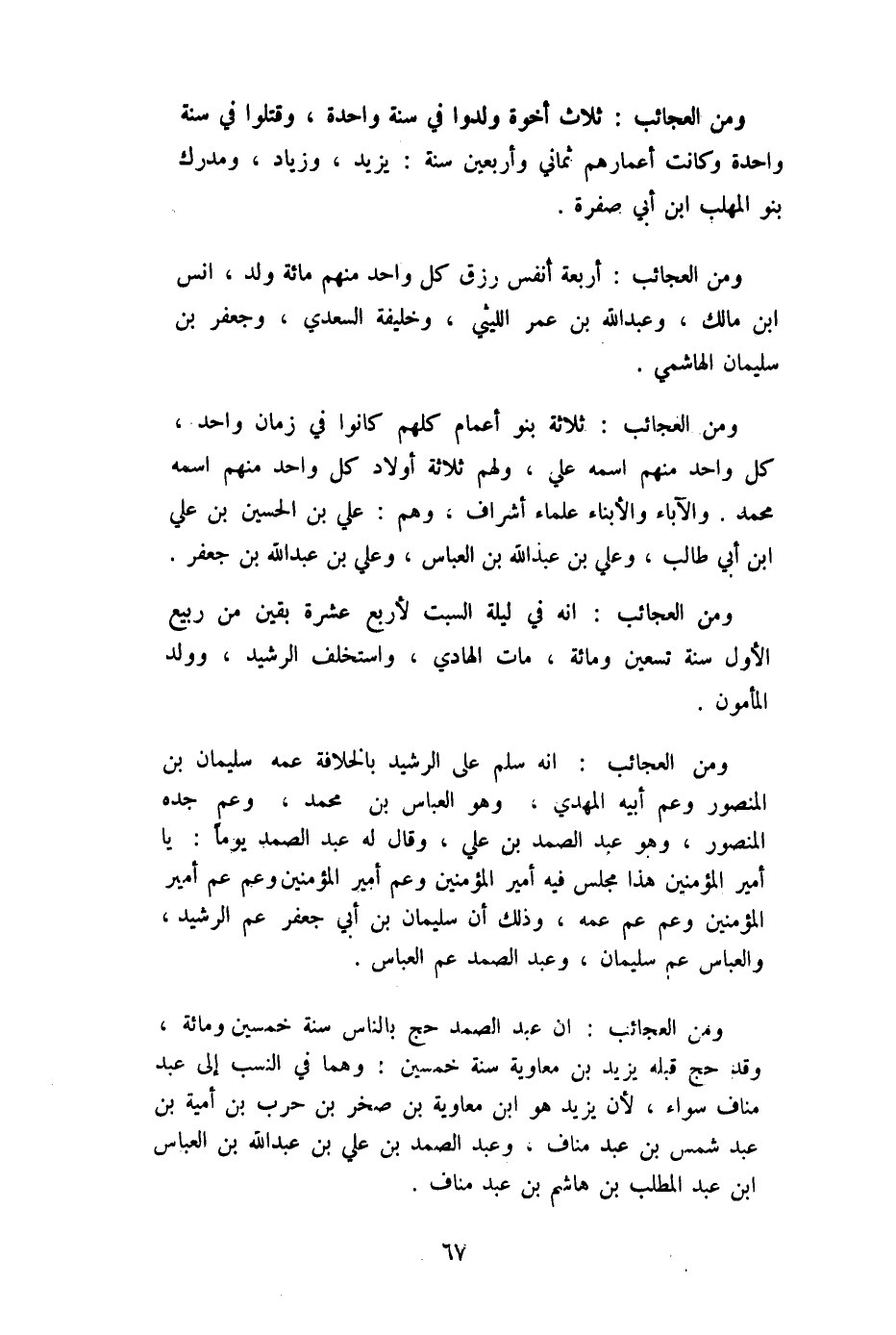 وَمن الْعَجَائِب أَرْبَعَة أنفس رزق كل وَاحِد مِنْهُم مائَة ولد أنس ابْن مَالك وَعبد الله بن عمر اللَّيْثِيّ وَخَلِيفَة السَّعْدِيّ وجعفر بن سُلَيْمَان الْهَاشِمِي