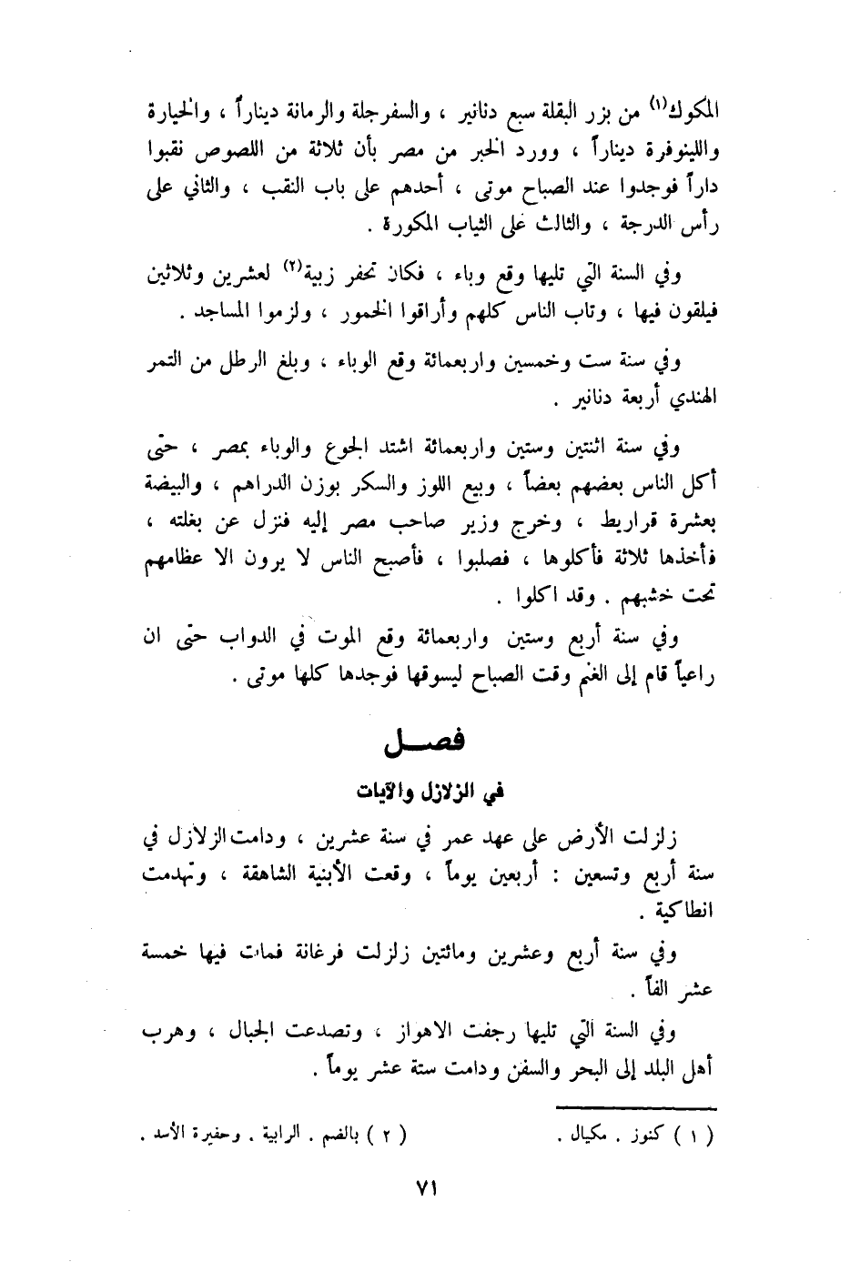 المكوك من بزر البقلة سبع دَنَانِير والسفرجلة والرمانة دِينَارا والخيارة واللينوفرة دِينَارا وَورد الْخَبَر من مصر بِأَن ثَلَاثَة من اللُّصُوص نقبوا دَارا فوجدوا عِنْد الصَّباح موتى أحدهم على بَاب النقب وَالثَّانِي على رَأس الدرجَة وَالثَّالِث على الثِّيَاب المكورة