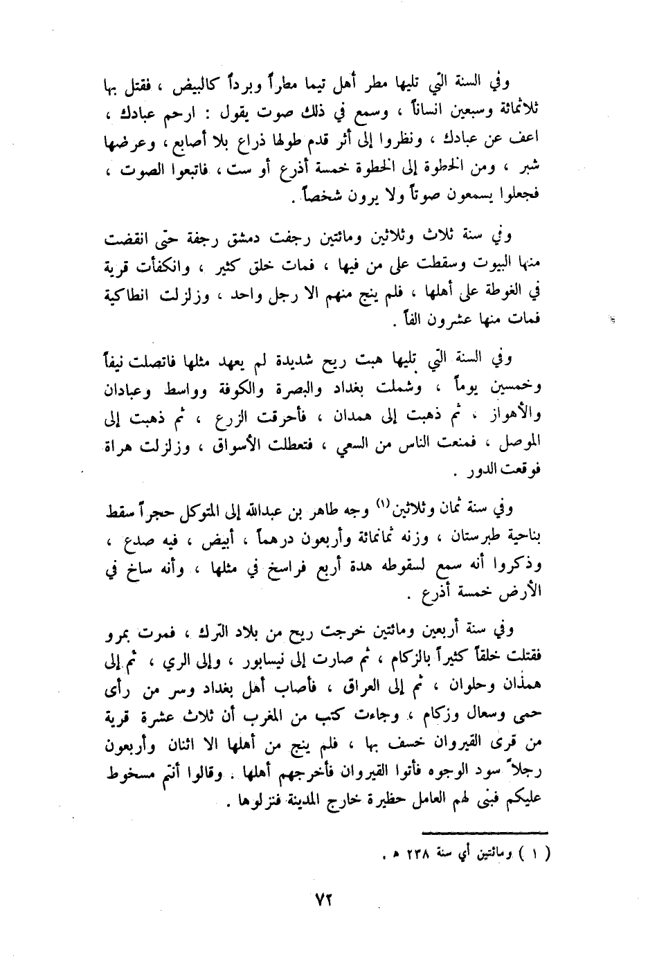 وَفِي السّنة الَّتِي تَلِيهَا هبت ريح شَدِيدَة لم يعْهَد مثلهَا فاتصلت نيفا وَخمسين يَوْمًا وشملت بَغْدَاد وَالْبَصْرَة والكوفة وواسط وعبادان والأهواز ثمَّ ذهبت إِلَى هَمدَان فأحرقت الزَّرْع ثمَّ ذهبت إِلَى الْموصل فمنعت النَّاس من السَّعْي فتعطلت الْأَسْوَاق وزلزلت هراة فَوَقَعت الدّور