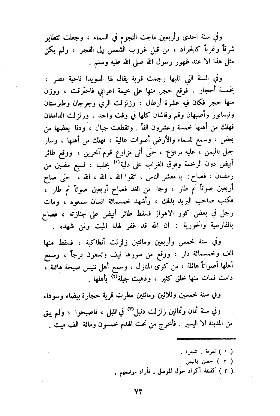 وَفِي السّنة الَّتِي تَلِيهَا رجمت قَرْيَة يُقَال لَهَا السويدا نَاحيَة مصر بِخَمْسَة أَحْجَار فَوَقع حجر مِنْهَا على خيمة أَعْرَابِي فاحترقت وَوزن مِنْهَا حجر فَكَانَ فِيهِ عشرَة أَرْطَال وزلزلت الرّيّ وجرجان وطبرستان ونيسابور وأصبهان وقم وقاشان كلهَا فِي وَقت وَاحِد وزلزلت الدامغان فَهَلَك من أَهلهَا خَمْسَة وَعِشْرُونَ ألفا وتقطعت جبال ودنا بَعْضهَا من بعض وَسمع للسماء وَالْأَرْض أصوات عالية فَهَلَك من أَهلهَا وَسَار جبل بِالْيمن عَلَيْهِ مزارع حَتَّى أَتَى مزارع قوم آخَرين وَوَقع طَائِر أَبيض دون الرخمة وَفَوق الْغُرَاب على دلبة بحلب لسبع مضين من رَمَضَان فصاح يَا معشر النَّاس اتَّقوا الله الله الله حَتَّى صَاح أَرْبَعِينَ صَوتا ثمَّ طَار وَجَاء من الْغَد فصاح أَرْبَعِينَ صَوتا ثمَّ طَار فَكتب صَاحب الْبَرِيد بذلك وَأشْهد خَمْسمِائَة إِنْسَان سَمِعُوهُ وَمَات رجل فِي بعض كور الأهواز فَسقط طَائِر أَبيض على جنَازَته فصاح بِالْفَارِسِيَّةِ والخورية إِن الله قد غفر لهَذَا الْمَيِّت وَلمن شهده