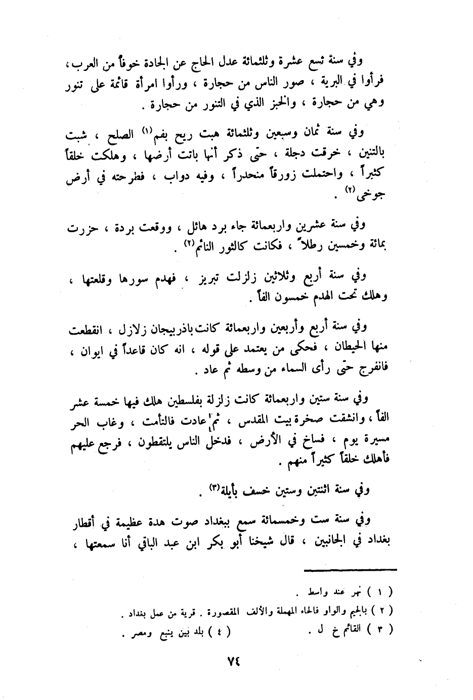 وَفِي سنة سِتّ وَخَمْسمِائة سمع بِبَغْدَاد صَوت هده عَظِيمَة فِي أقطار بَغْدَاد فِي الْجَانِبَيْنِ قَالَ شَيخنَا أَبُو بكر ابْن عبد الْبَاقِي أَنا سَمعتهَا