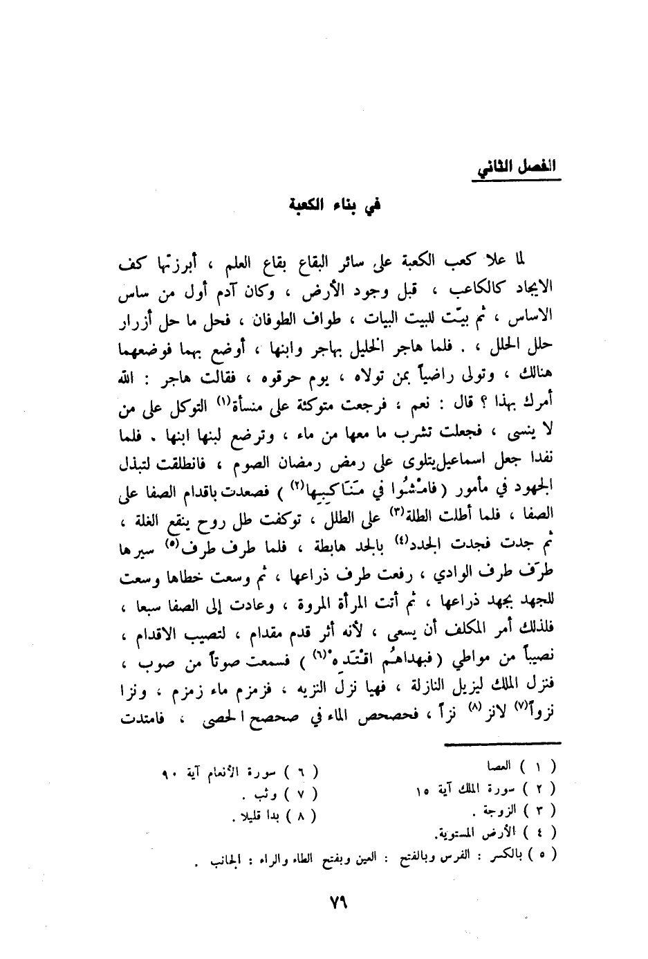 لما علا كَعْب الْكَعْبَة على سَائِر الْبِقَاع بقاع الْعلم أبرزتها كف الإيجاد كالكاعب قبل وجود الأَرْض وَكَانَ آدم أول من سَاس الأساس ثمَّ بَيت للبيت البيات طواف الطوفان فَحل مَا حل أزرار حلل الْحلَل فَلَمَّا هَاجر الْخَلِيل بهاجر وَابْنهَا أوضع بهما فوضعهما هُنَالك وَتَوَلَّى رَاضِيا بِمن تولاه يَوْم حرقوه فَقَالَت هَاجر الله أَمرك بِهَذَا قَالَ نعم فَرَجَعت متوكئة على منسأة التَّوَكُّل على من لَا ينسى فَجعلت تشرب مَا مَعهَا من مَاء وترضع لَبنهَا ابْنهَا فَلَمَّا نفدا جعل إِسْمَاعِيل يتلوى على رمض رَمَضَان الصَّوْم فَانْطَلَقت لتبذل الجهود فِي مَأْمُور {فامشوا فِي مناكبها} فَصَعدت بأقدام الصَّفَا على الصَّفَا فَلَمَّا أطلت الطلة على الطلل توكفت طل روح ينقع الْغلَّة ثمَّ جدت فجدت الجدد بالجد هابطة فَلَمَّا طرف طرف سَيرهَا طرف طرف الْوَادي رفعت طرف ذراعها ثمَّ وسعت خطاها وسعت للجهد بِجهْد ذراعها ثمَّ أَتَت الْمَرْأَة الْمَرْوَة وعادت إِلَى الصَّفَا سبعا فَلذَلِك أَمر الْمُكَلف أَن يسْعَى لِأَنَّهُ أثر قدم مِقْدَام لتصيب الْأَقْدَام نَصِيبا من مواطي {فبهداهم اقتده} فَسمِعت صَوتا من صوب فَنزل الْملك ليزيل النَّازِلَة فهيا نزل النزيه فزمزم مَاء زَمْزَم ونزا نَزْوًا لانز فحصحص المَاء فِي صحصح الْحَصَى فامتدت